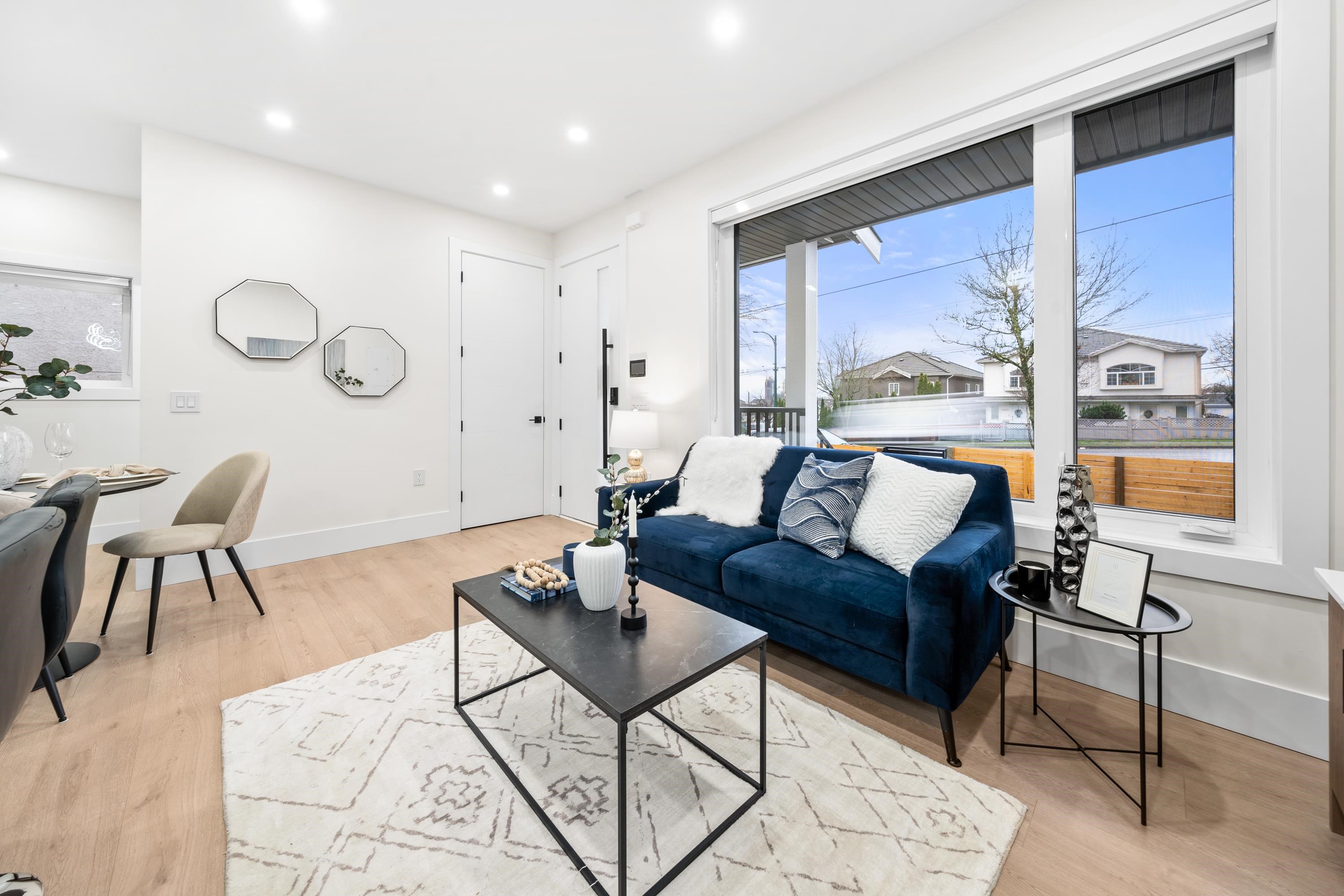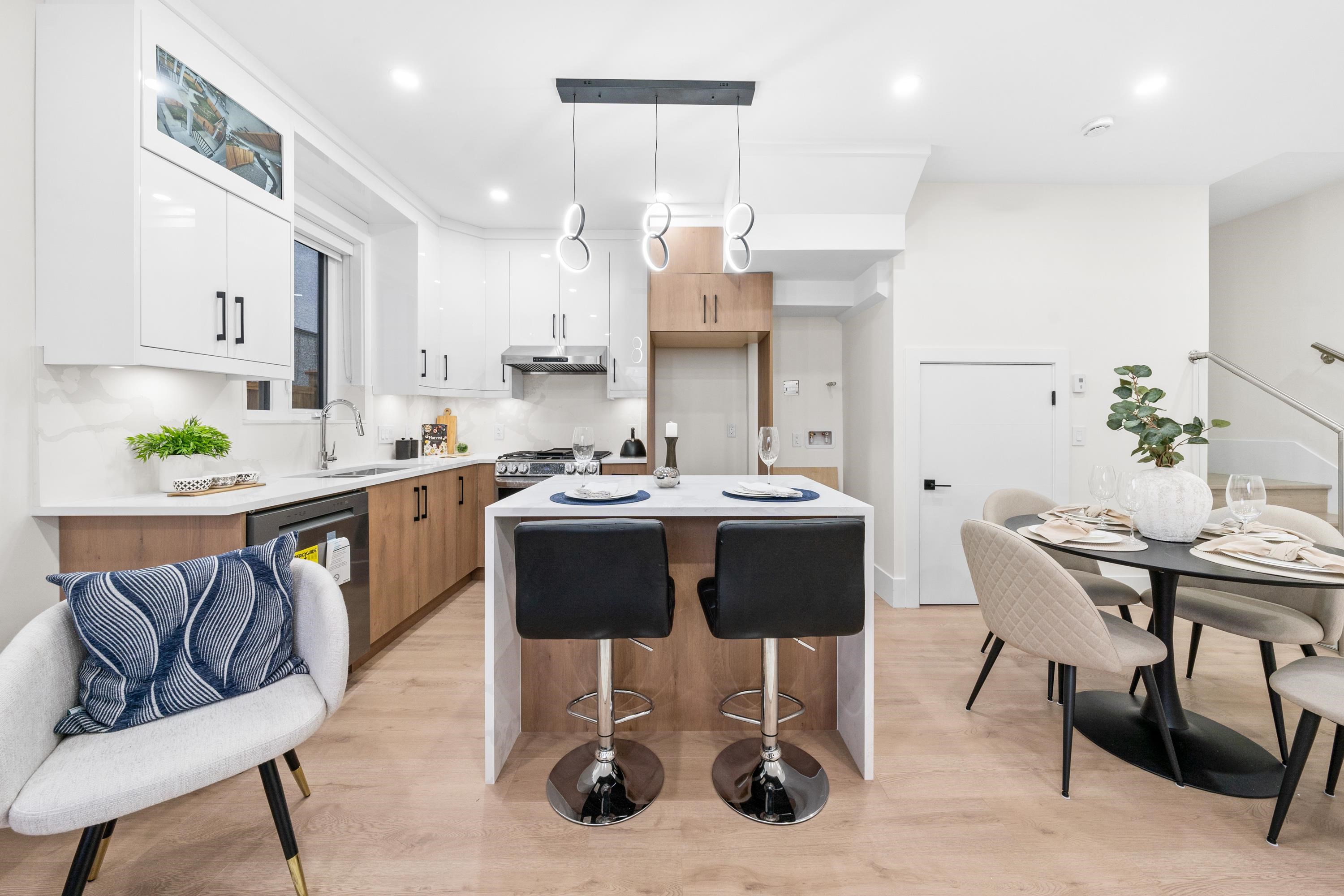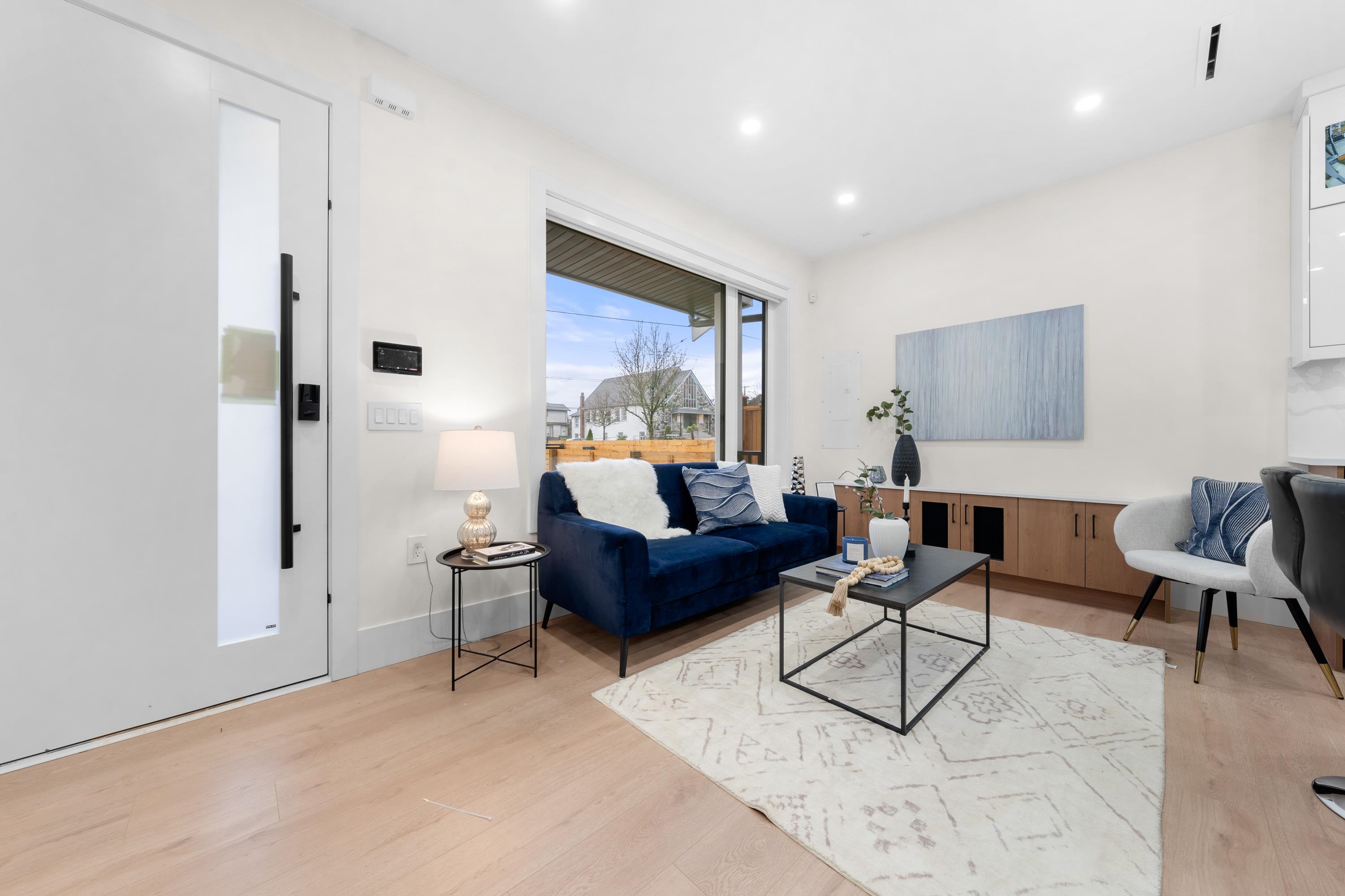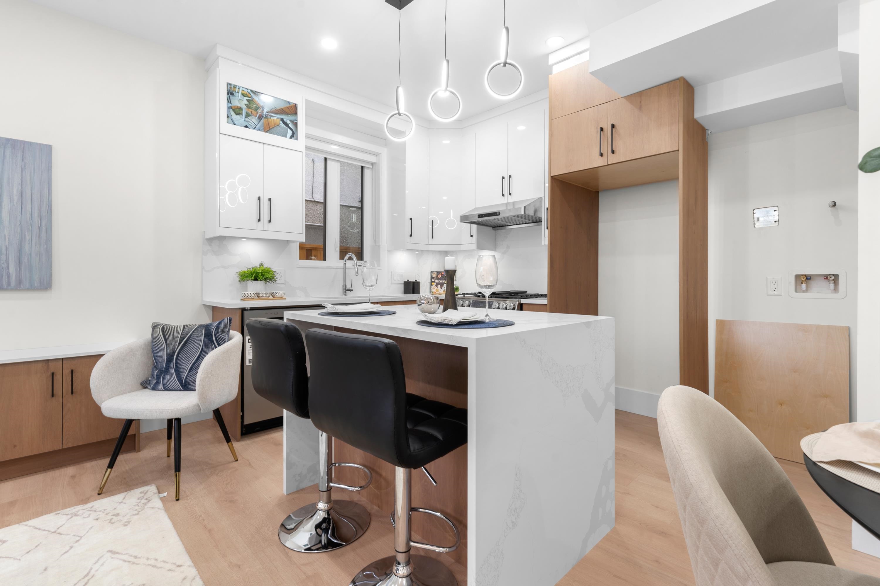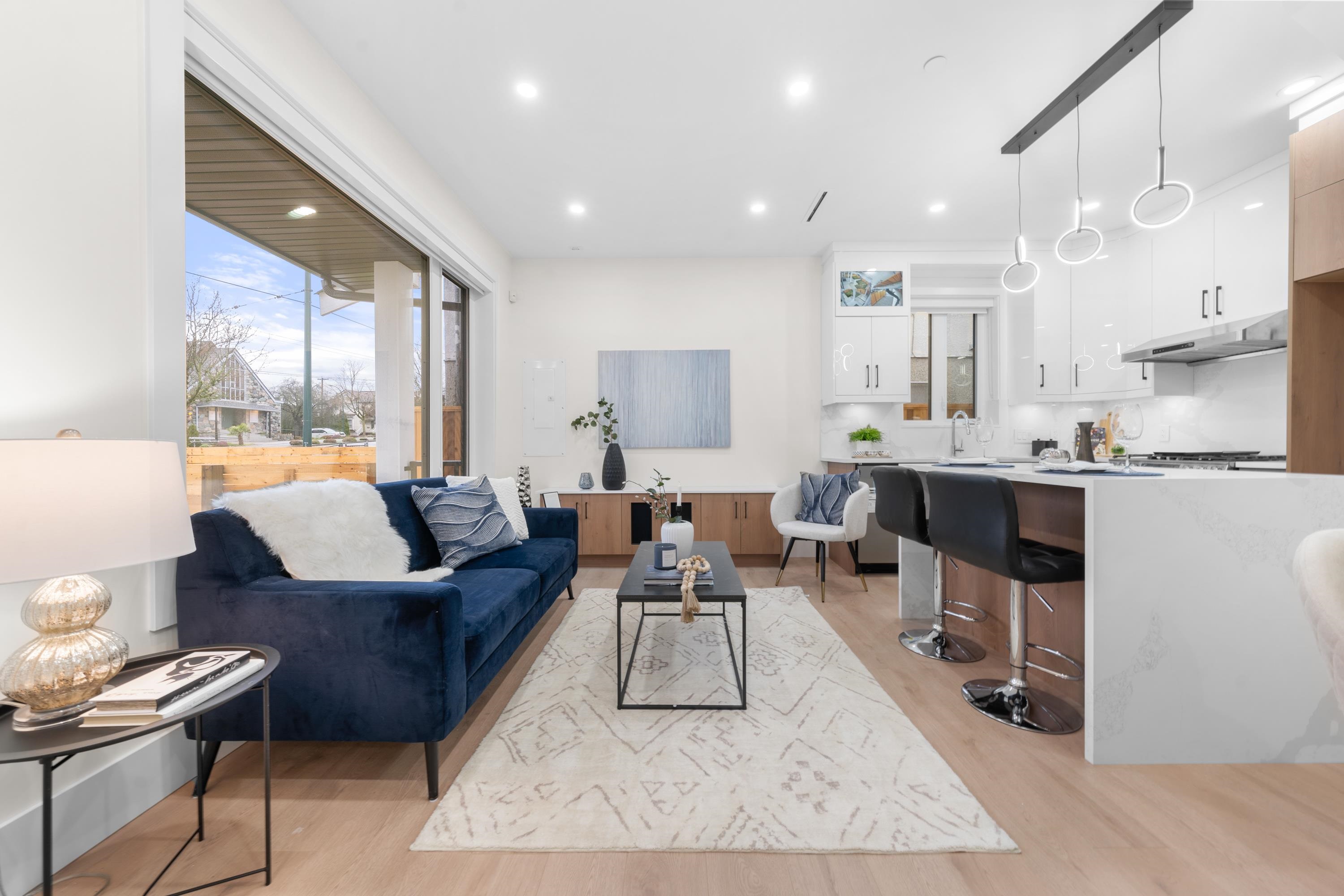 This brand-new Front duplex in South Vancouver offers a perfect blend of modern design and convenience. The upper floor features three bright and spacious bedrooms, including a master suite with a private ensuite bathroom. On the main floor, the open-concept layout showcases a large living area, dining space, and a gourmet kitchen equipped with sleek stainless steel appliances—ideal for both daily living and entertaining. A convenient powder room adds to the functionality of the main floor. Situated in a prime location on Main Street, this home is within walking distance to shopping, schools, and transit. Additionally, it boasts a spacious two-car garage, providing ample parking and extra storage space.