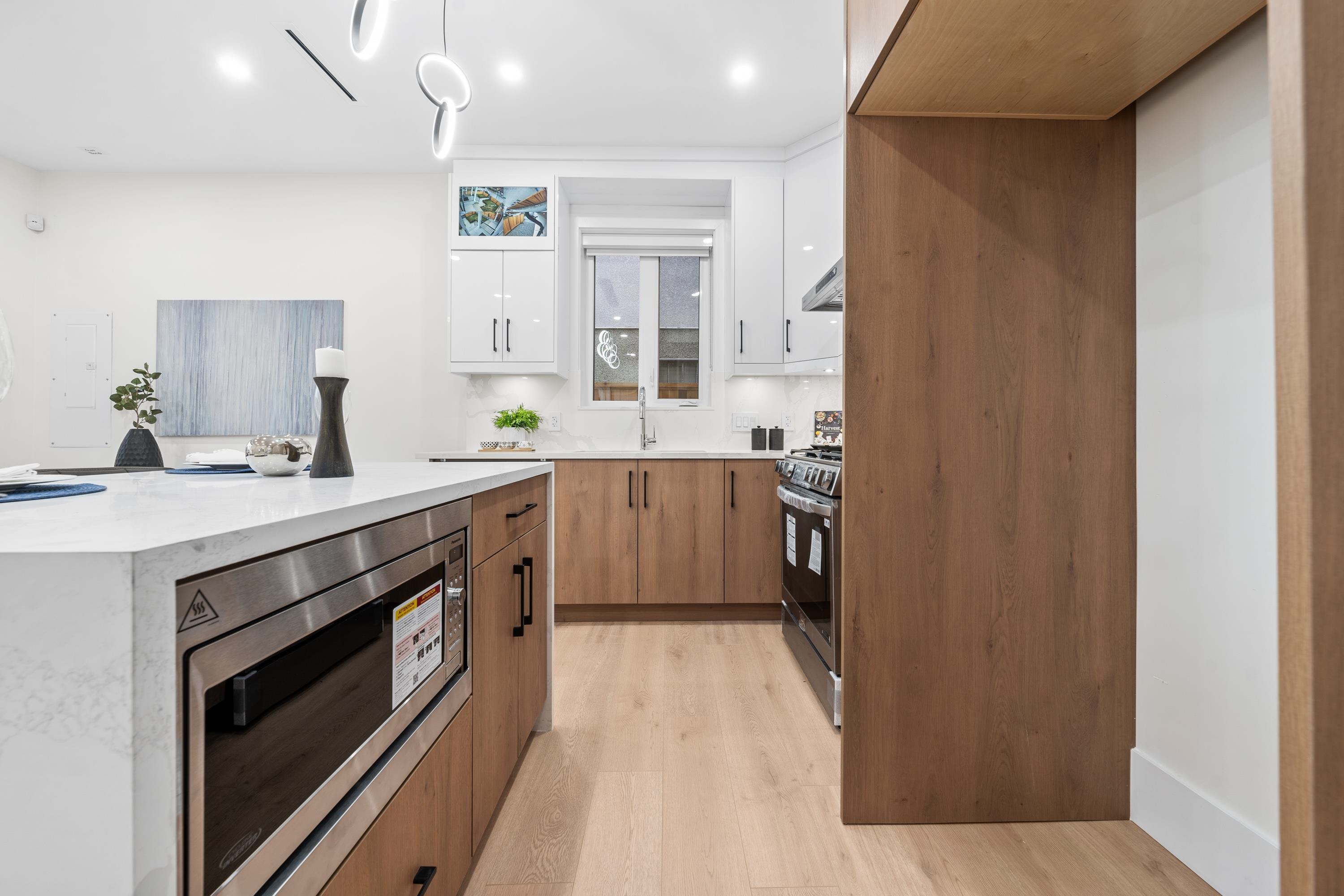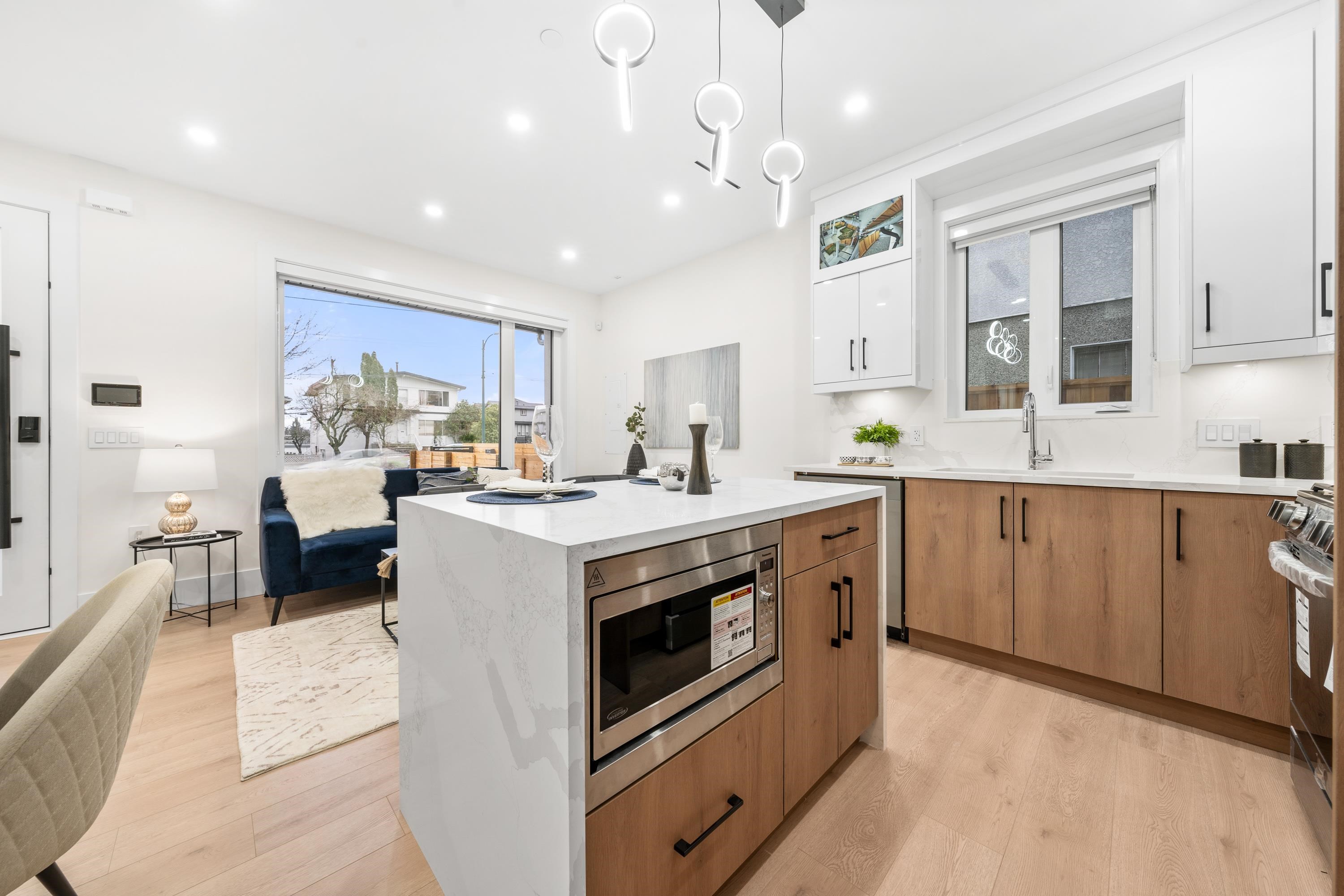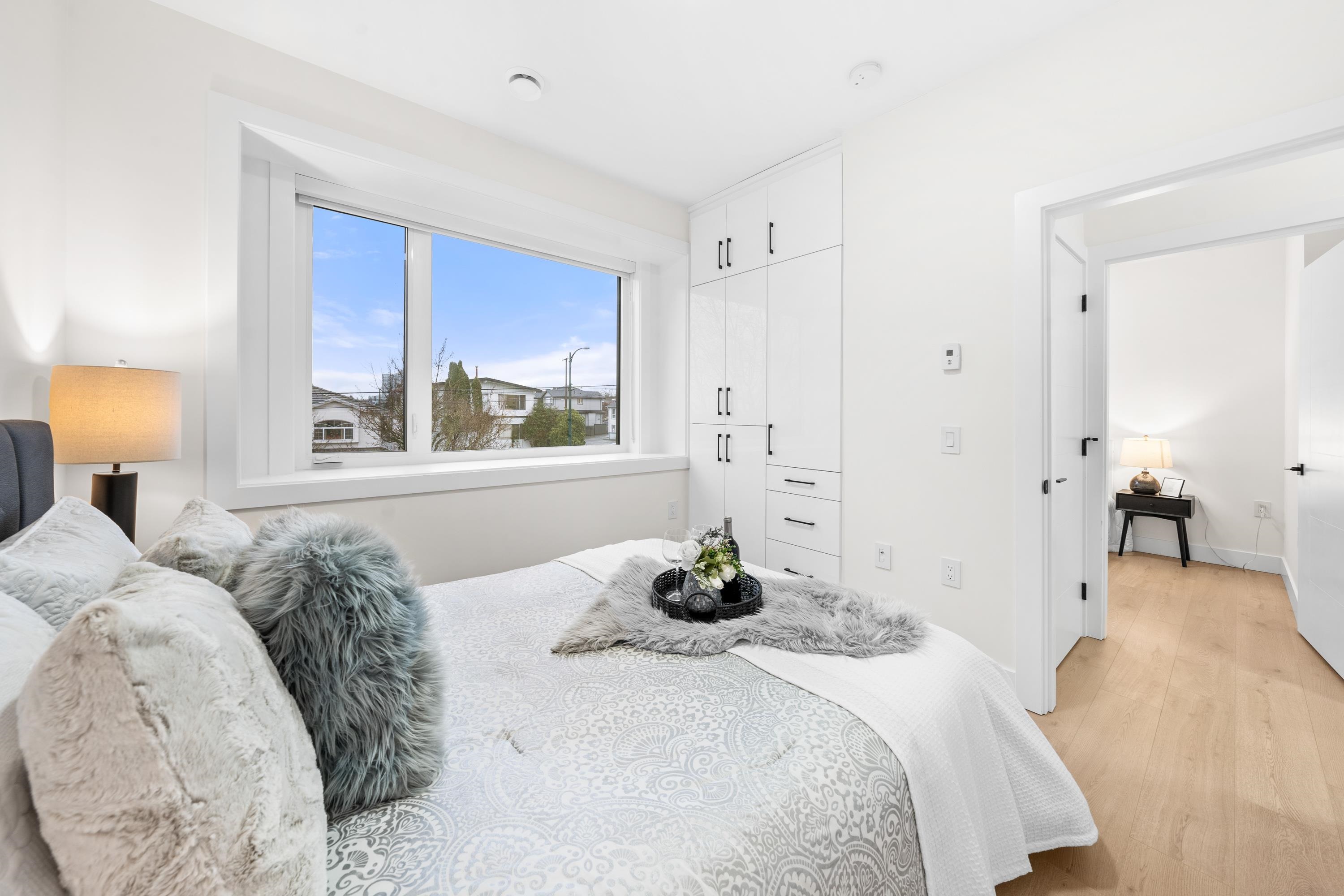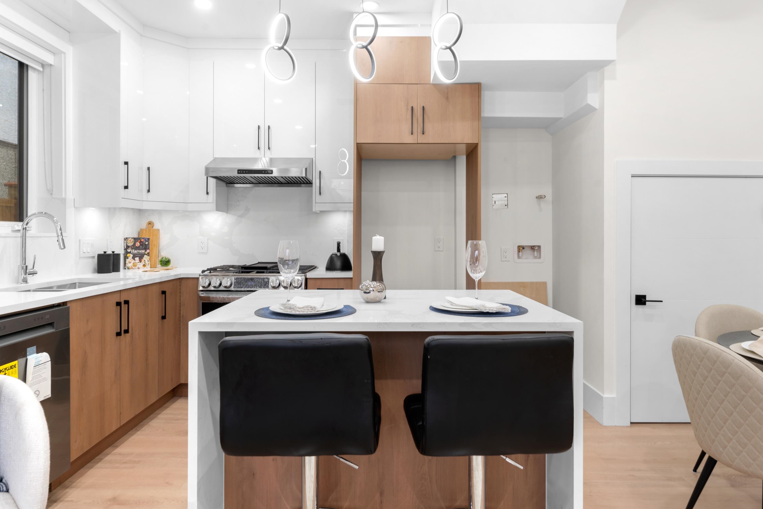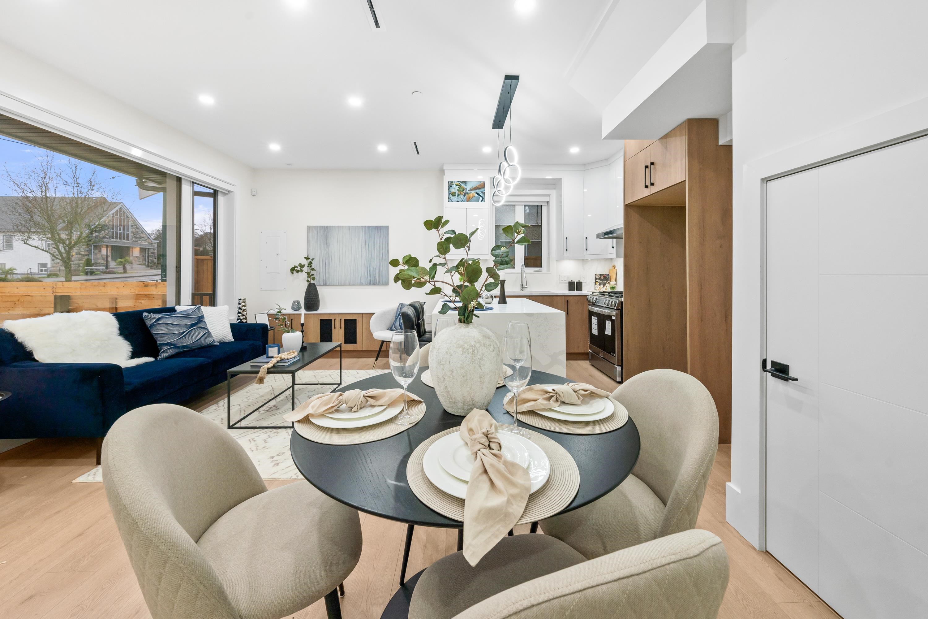 This brand-new Front duplex in South Vancouver offers a perfect blend of modern design and convenience. The upper floor features three bright and spacious bedrooms, including a master suite with a private ensuite bathroom. On the main floor, the open-concept layout showcases a large living area, dining space, and a gourmet kitchen equipped with sleek stainless steel appliances—ideal for both daily living and entertaining. A convenient powder room adds to the functionality of the main floor. Situated in a prime location on Main Street, this home is within walking distance to shopping, schools, and transit. Additionally, it boasts a spacious two-car garage, providing ample parking and extra storage space.