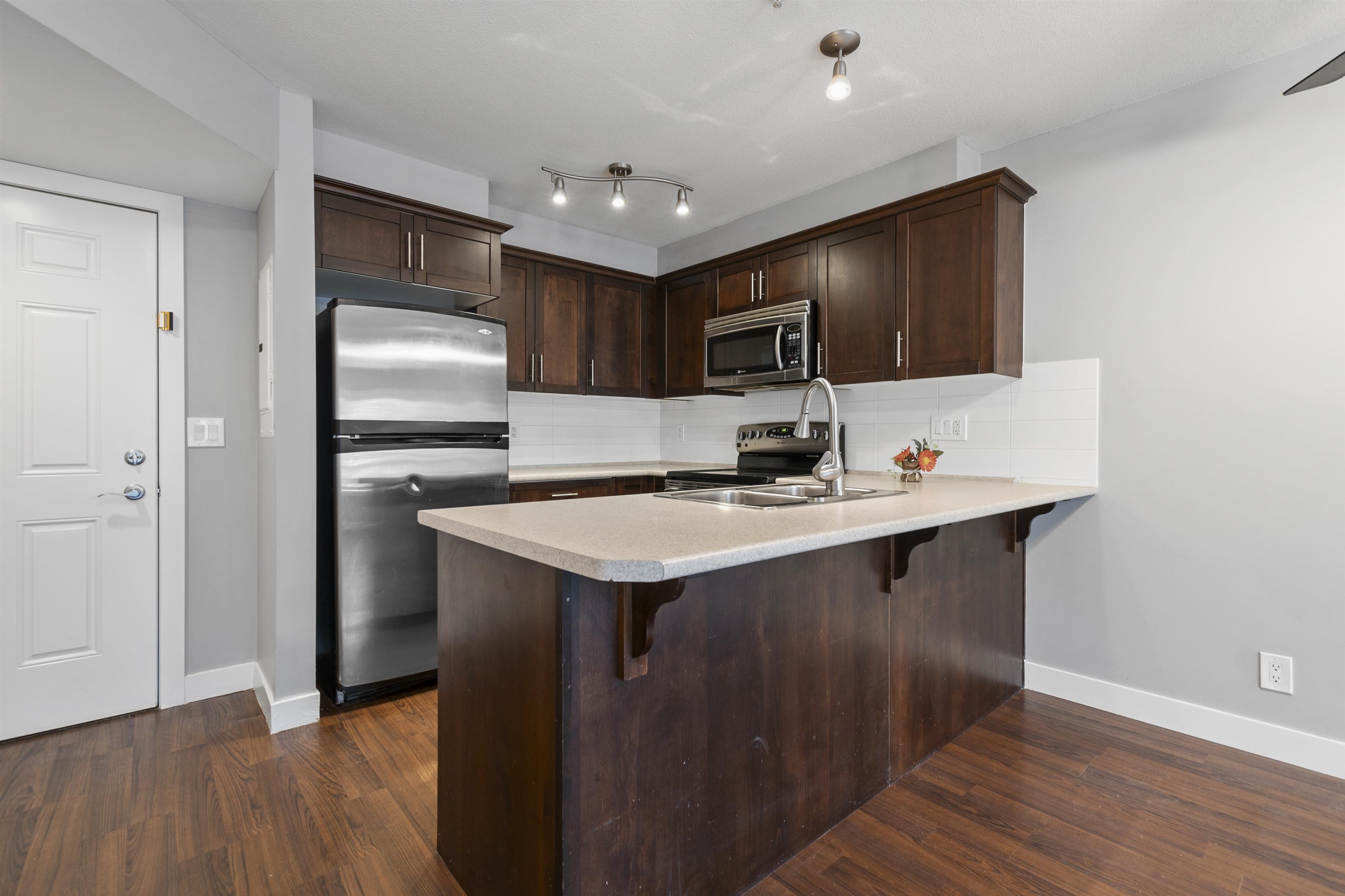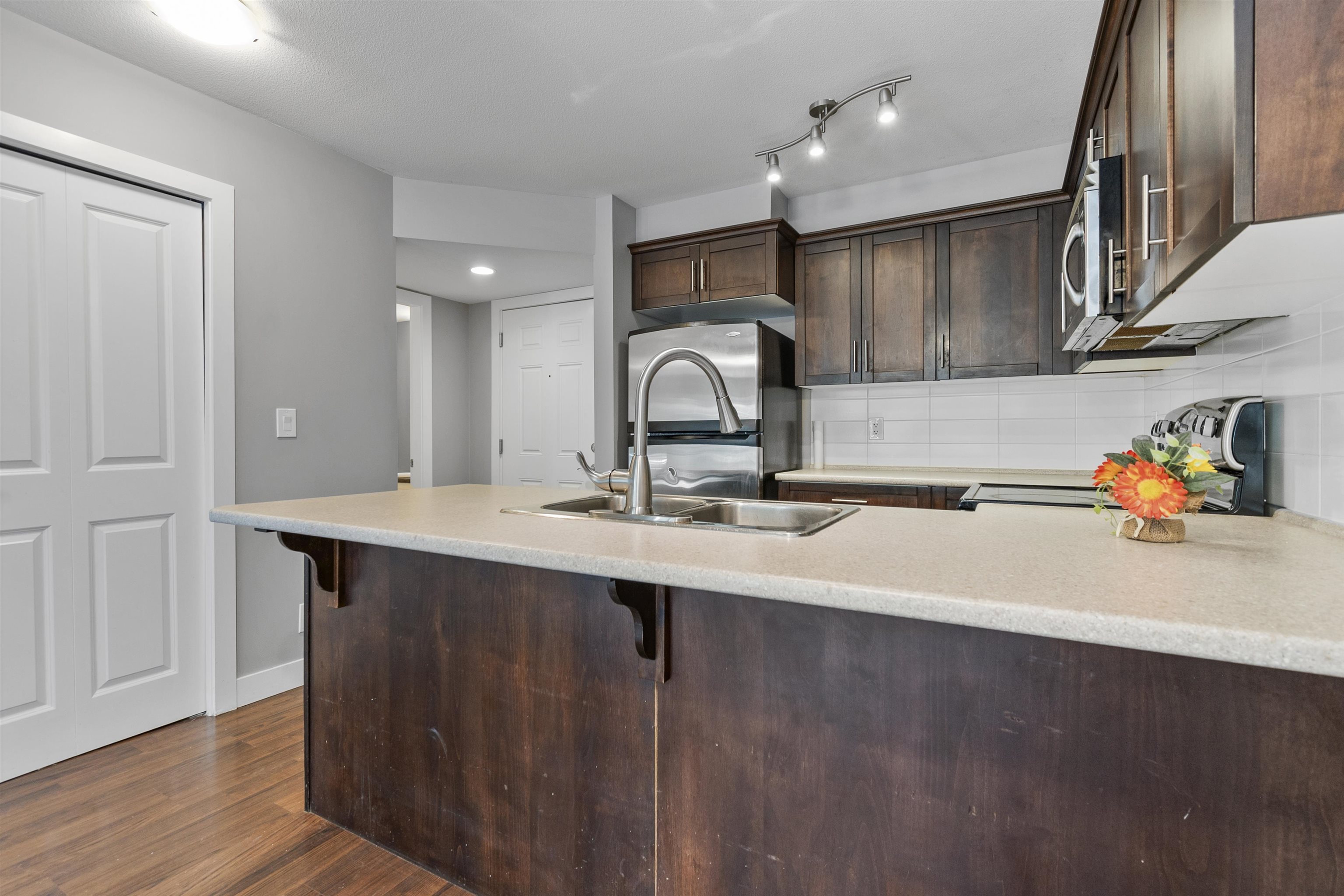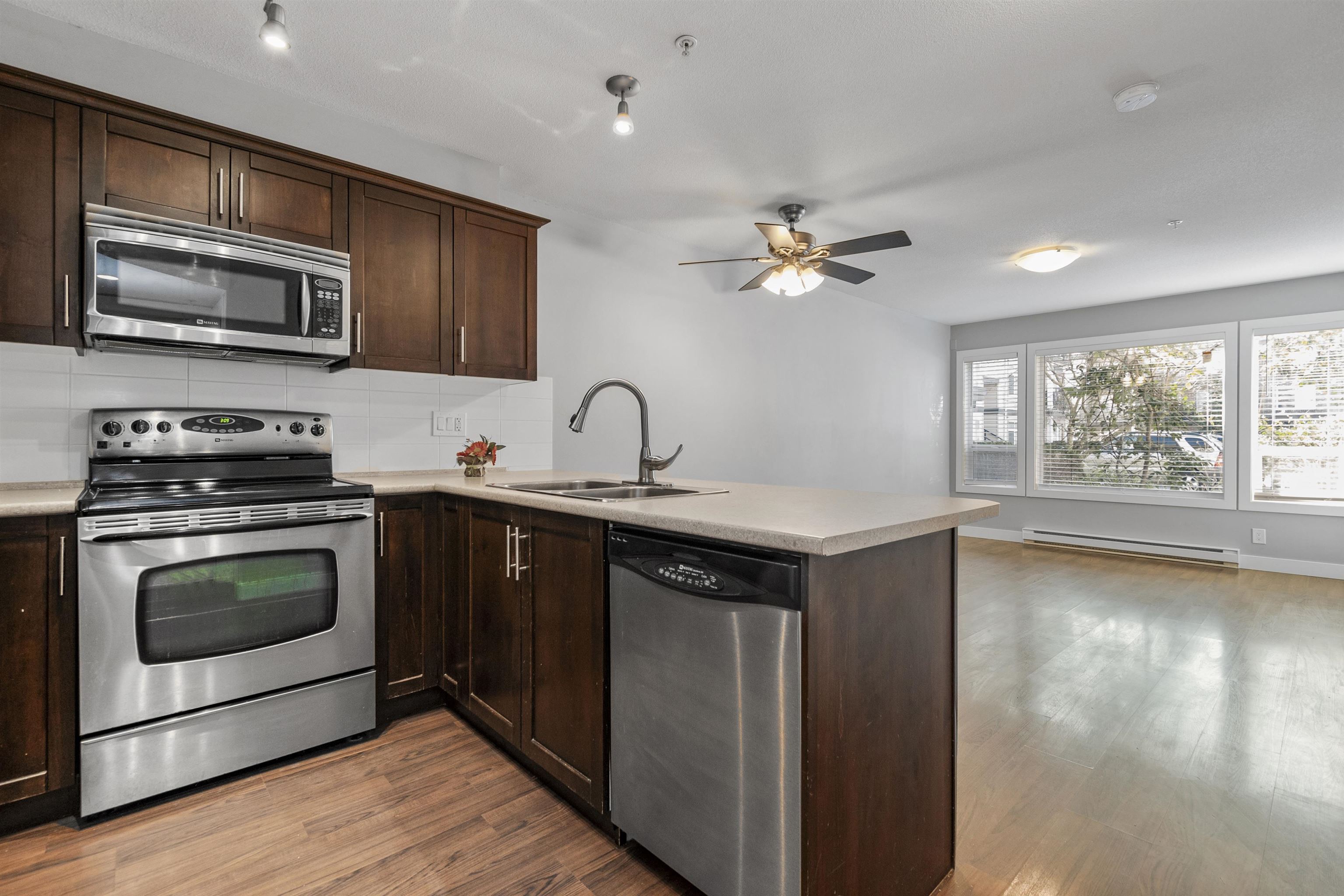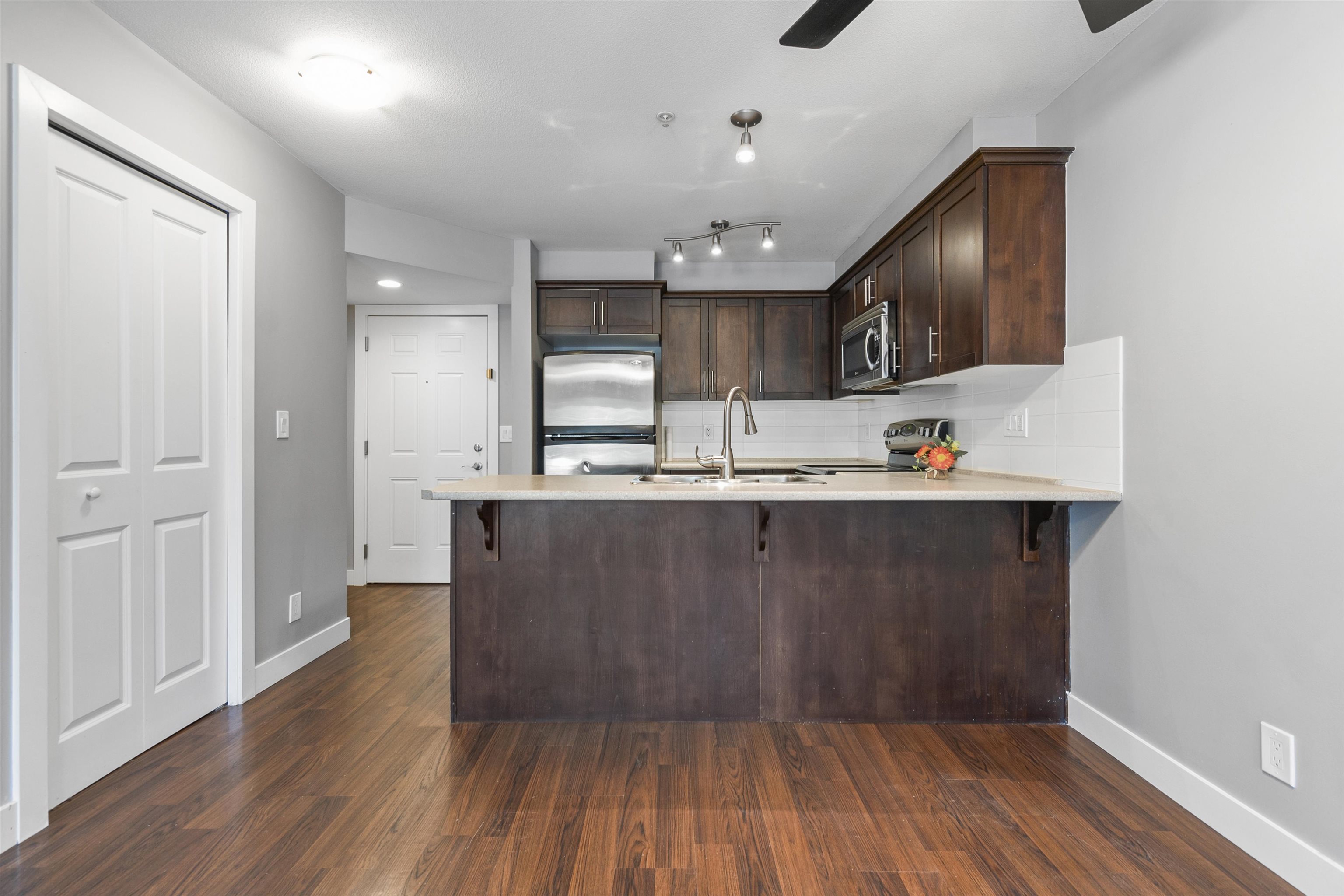 Fantastic opportunity for investors or first-time homebuyers! Discover this inviting ground floor unit featuring 1 bedroom, 1 bathroom, and a charming patio overlooking the courtyard. Enjoy the convenience of in-suite laundry and modern appliances including stainless steel fridge, stove, dishwasher, and microwave. Benefit from secured underground parking. This property welcomes both rentals and pets. Ideally situated near the revitalized District 1881, as well as shopping, schools, and recreational facilities. With this unit currently vacant, seize the chance to find your own tenant for investment purposes or move in at your earliest convenience.
