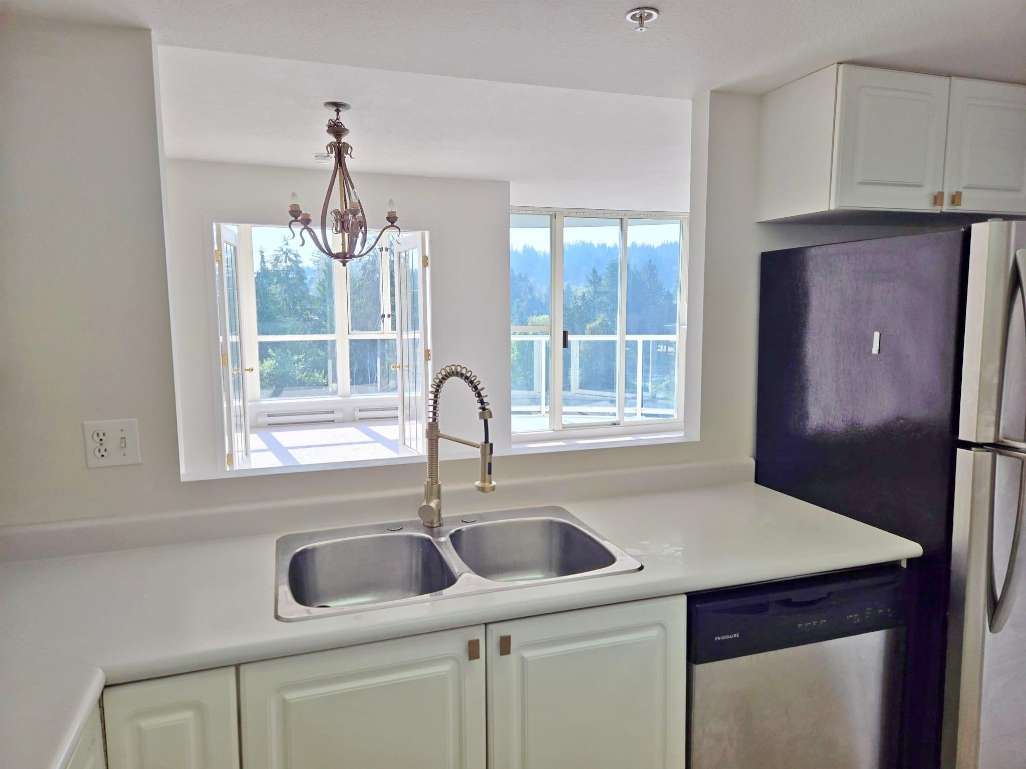 Spacious 2 bedrooms plus den/office over 1200 sq ft in well built BOSA building, located in the heart of Port Moody, walk to Newport Village and Suter Brook shopping area with lots of trendy and speciity shops. Close to Inlet skytrain station and Eagle Ridge Hospital. Well managed building including repiped in 2017 and with EV chargers in Visitor parking area. Laminated flooring throughout installed 6 months ago. Come with two parking stall is a bonus. Act fast.