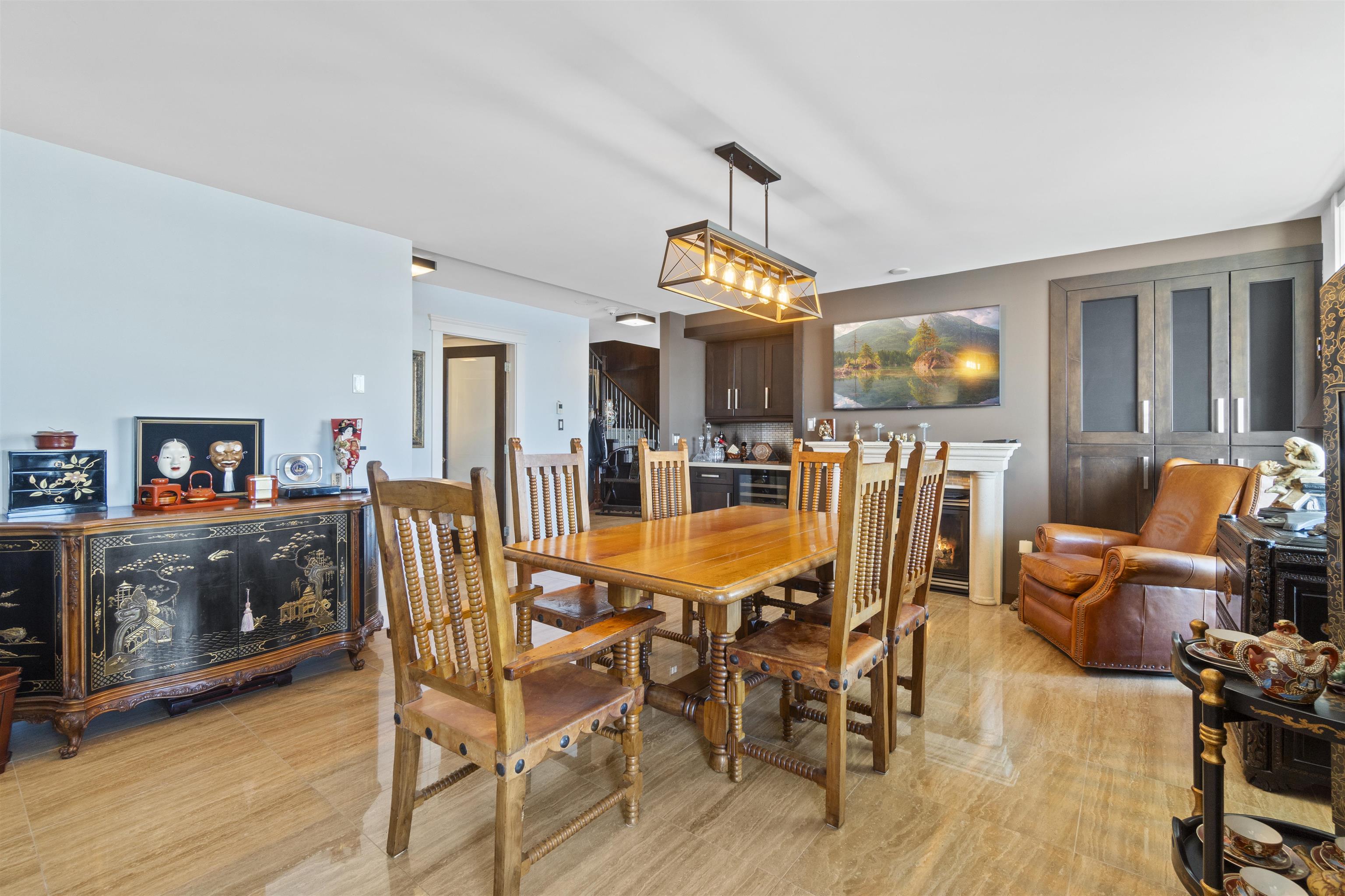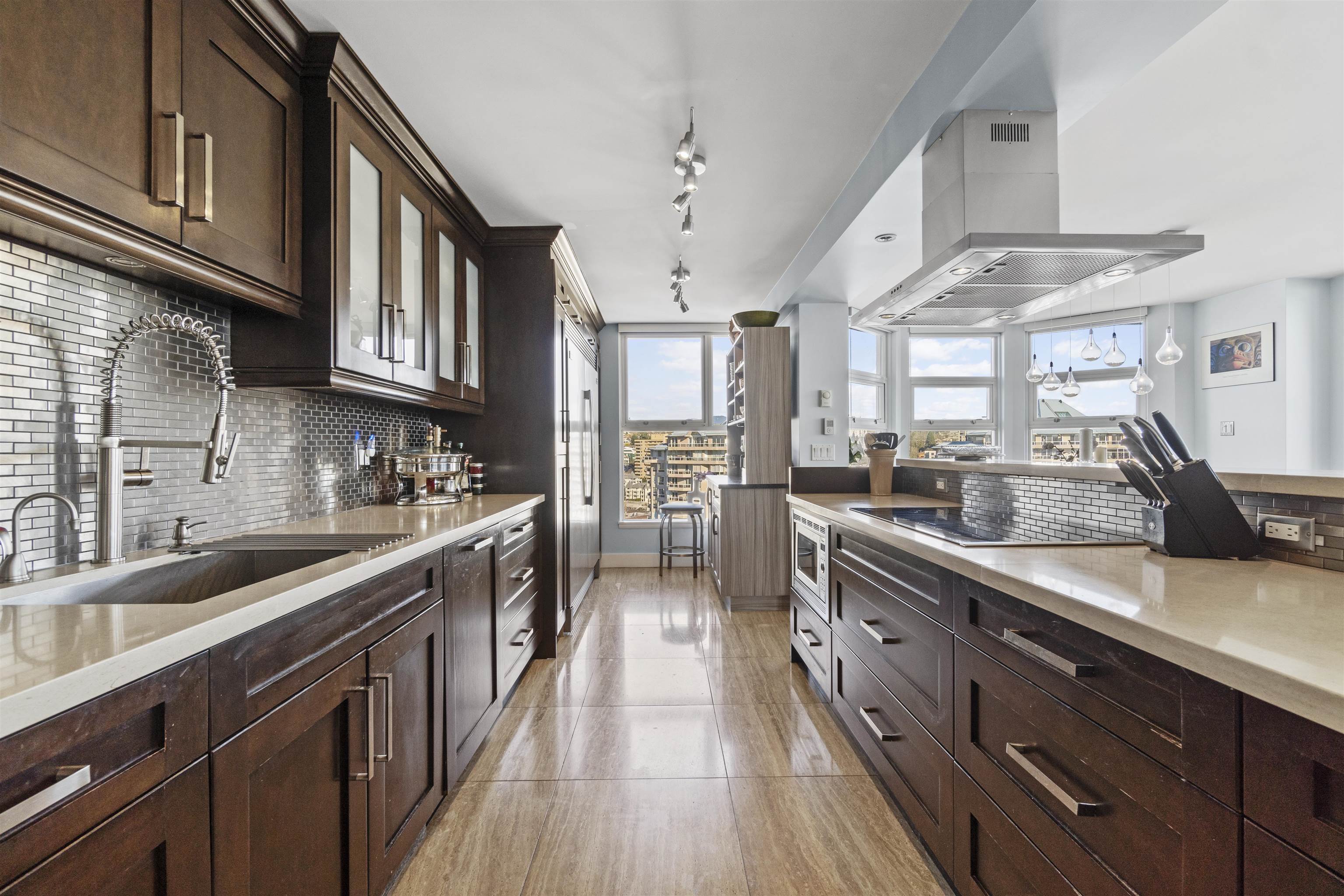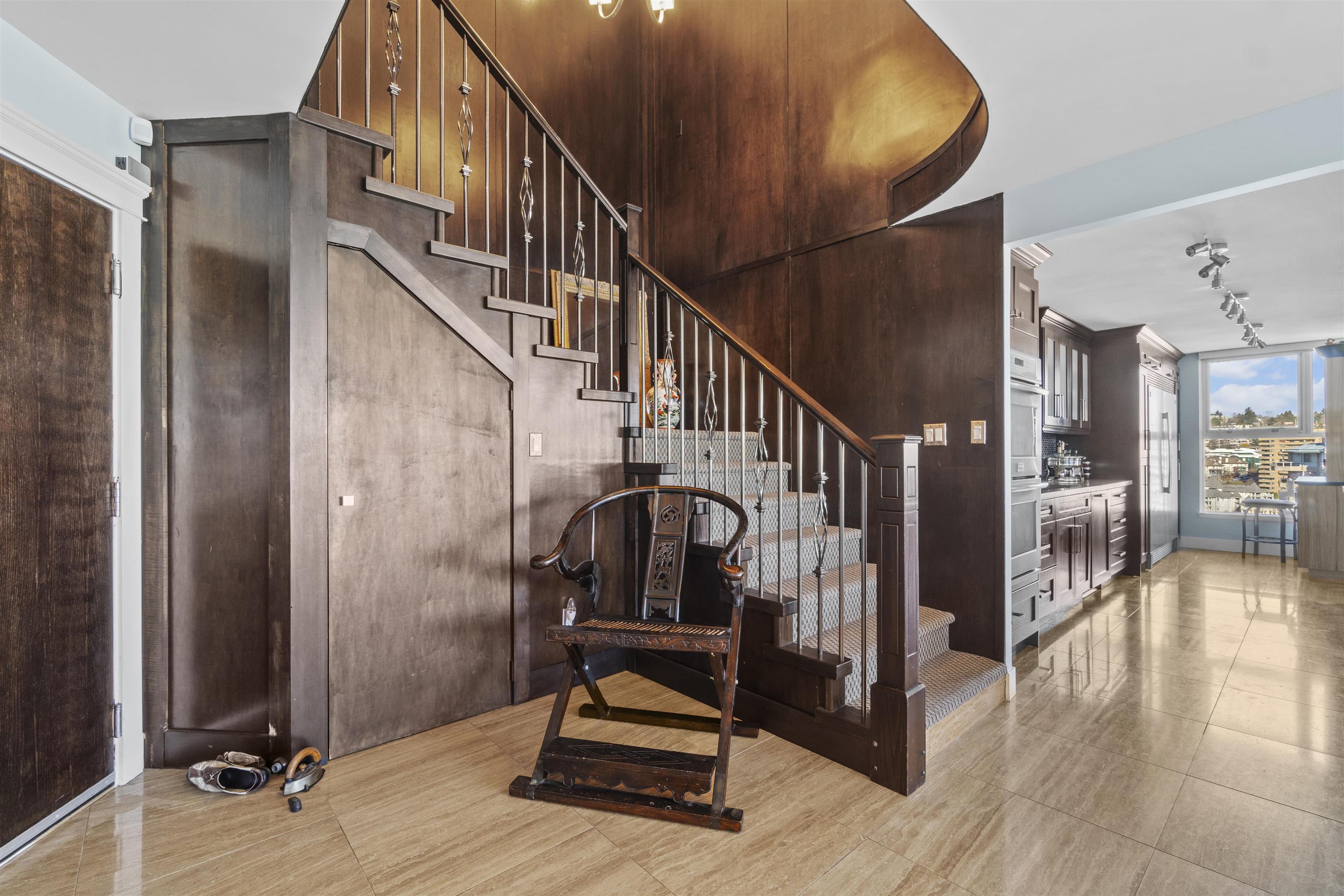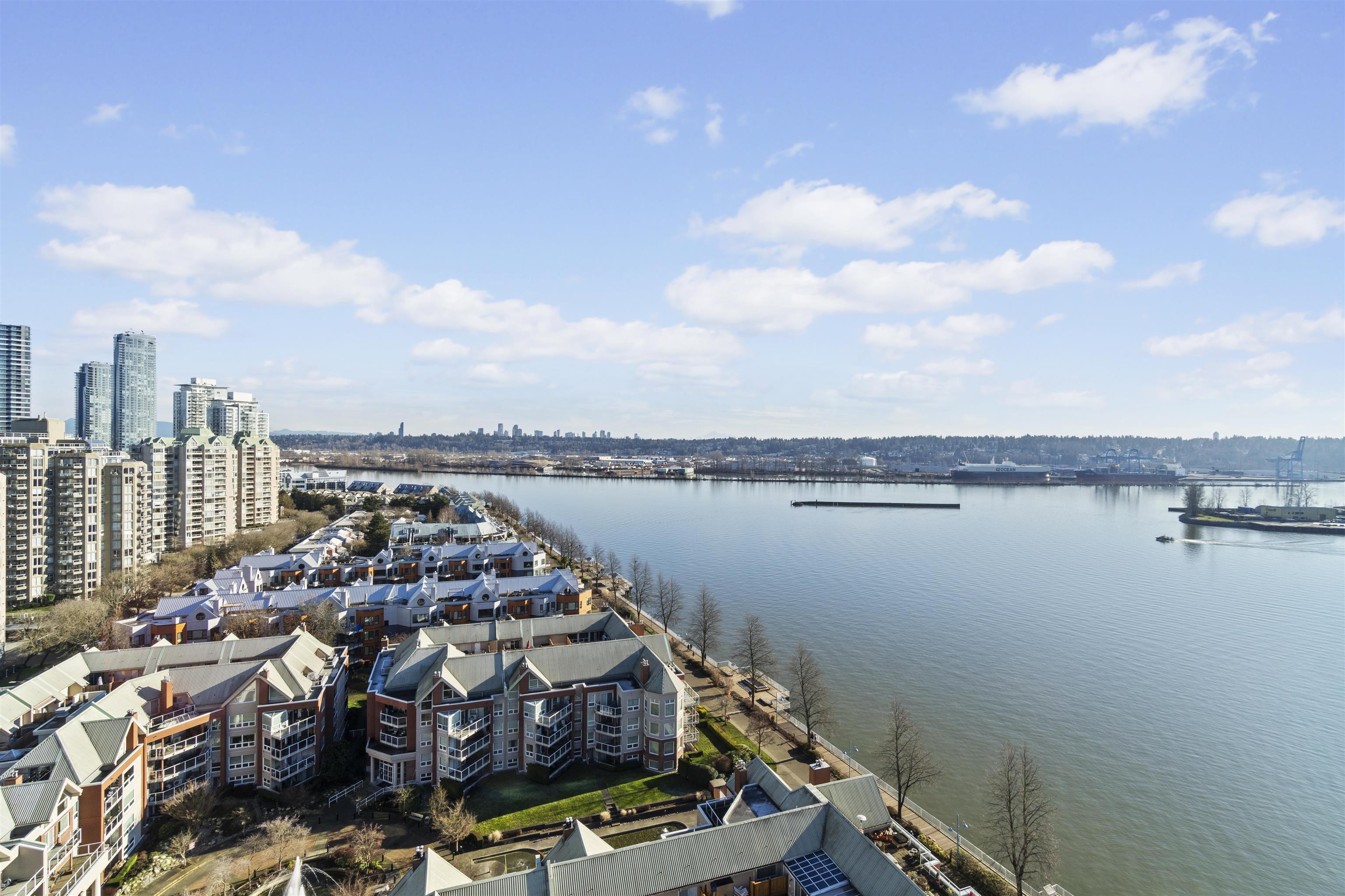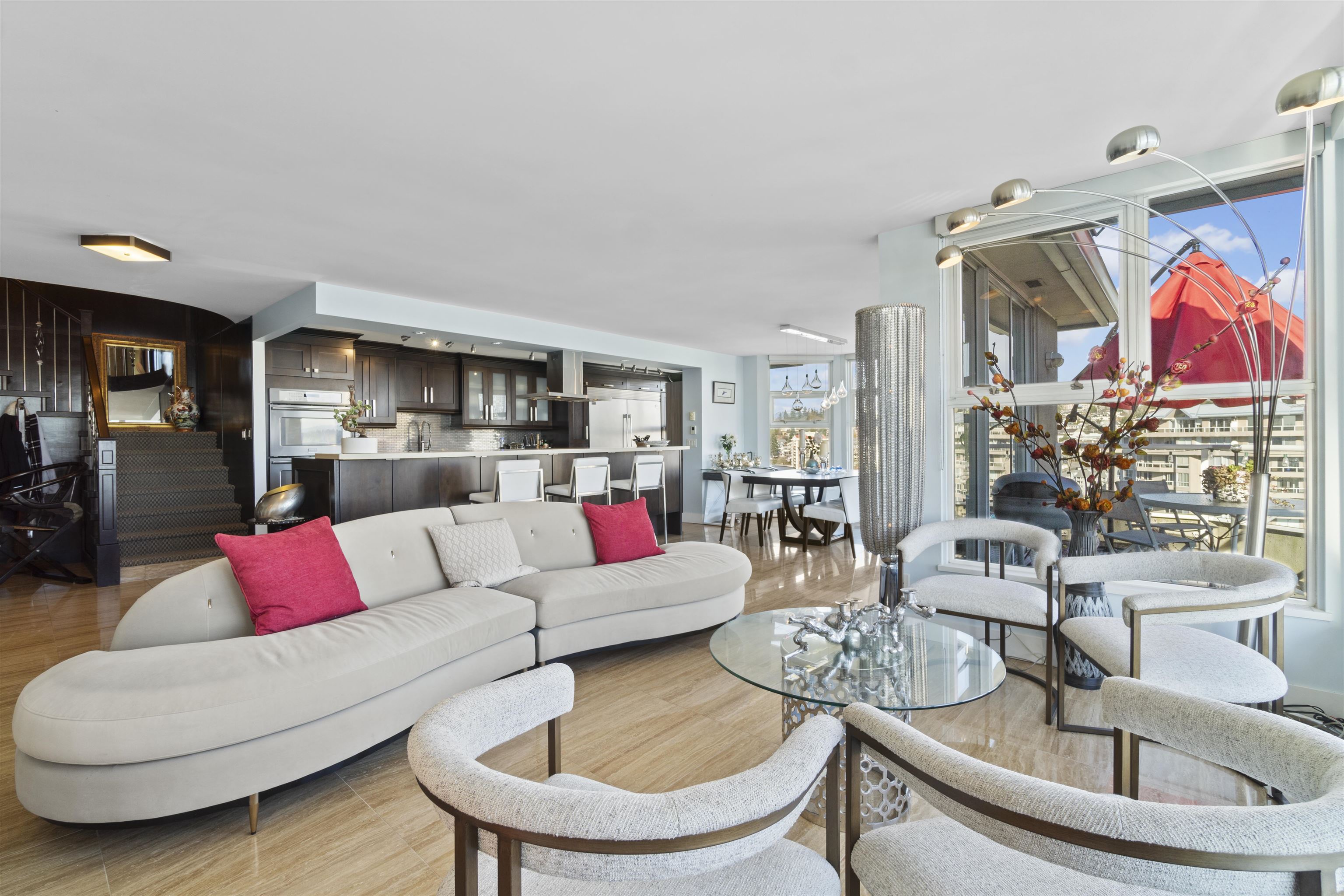 Incredible Renovation with Panoramic River Views – A Penthouse Like No Other! This luxurious penthouse blends elegance and comfort. The two-story entryway with coffered ceilings and a chandelier sets the tone, leading to a chef’s kitchen with a 14' island, double convection ovens, a full-size fridge/freezer, and an induction cooktop. Spacious living and dining areas flow to a deck, while the cozy family room with a gas fireplace opens to another with river views. The serene primary bedroom boasts a spa-like ensuite, custom closets, and a private office. Upstairs, enjoy AC, three bedrooms, a den with a fireplace, a jetted tub, and the third deck. Steps from the Seawall and SkyTrain, this is waterfront living at its finest!