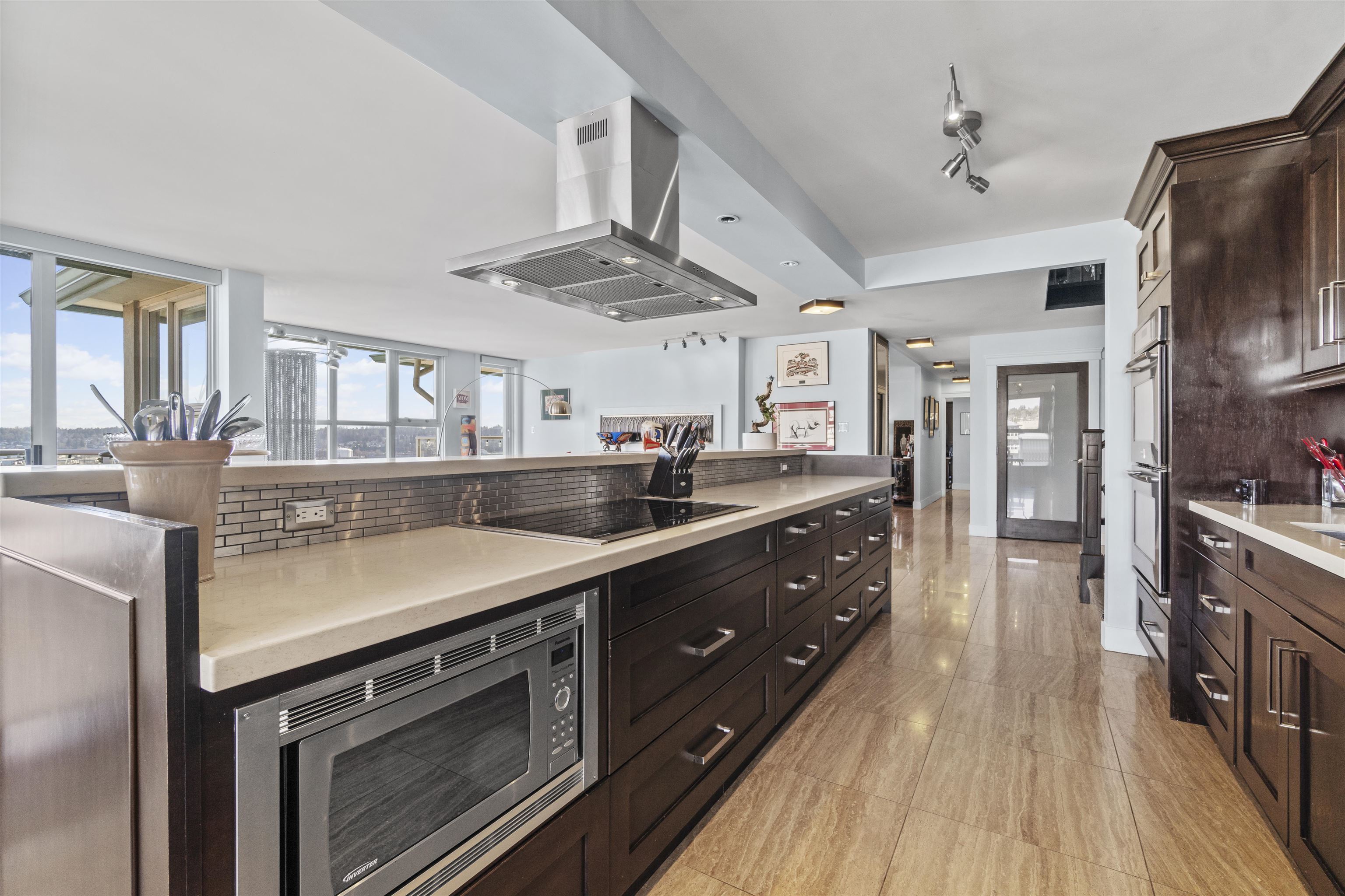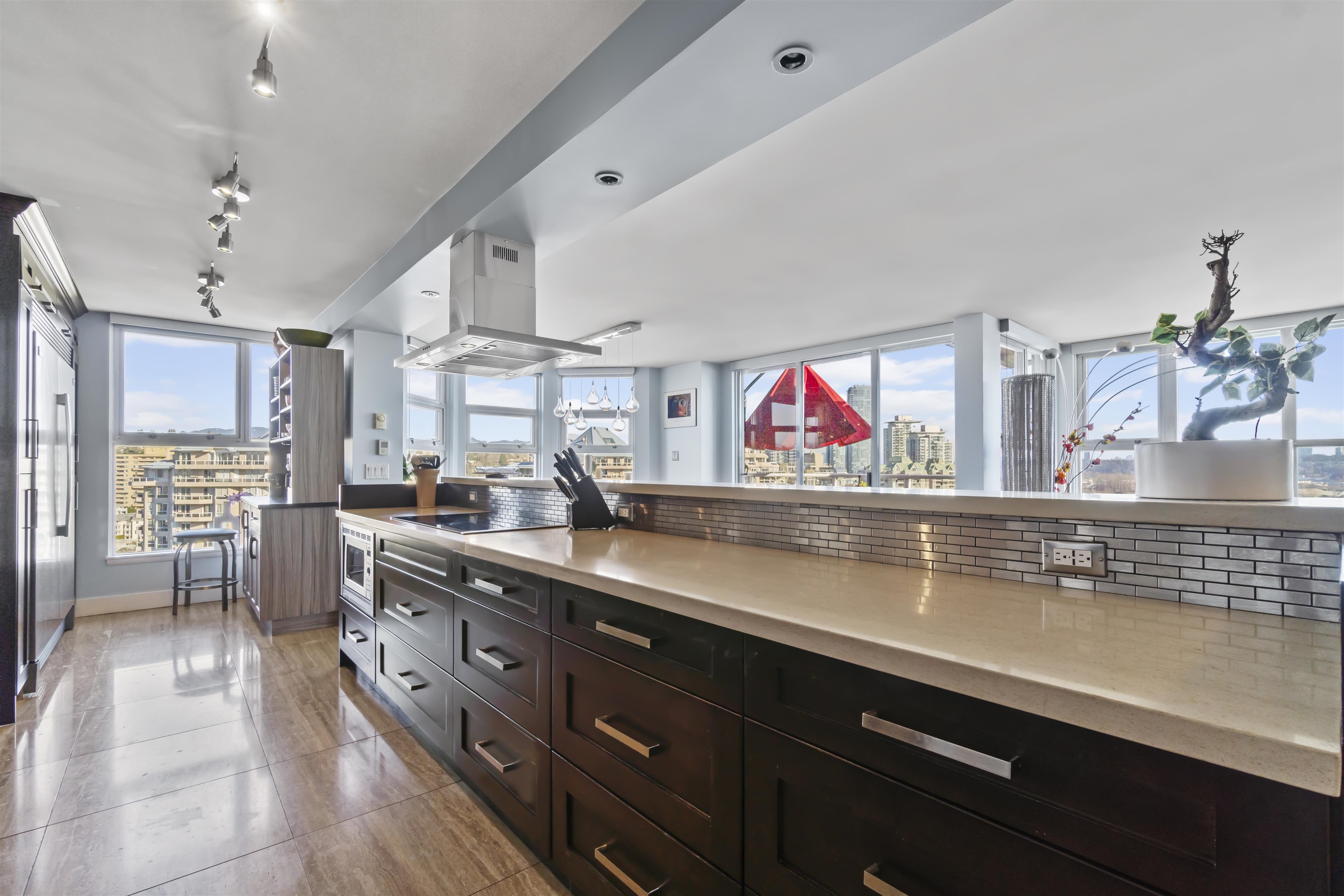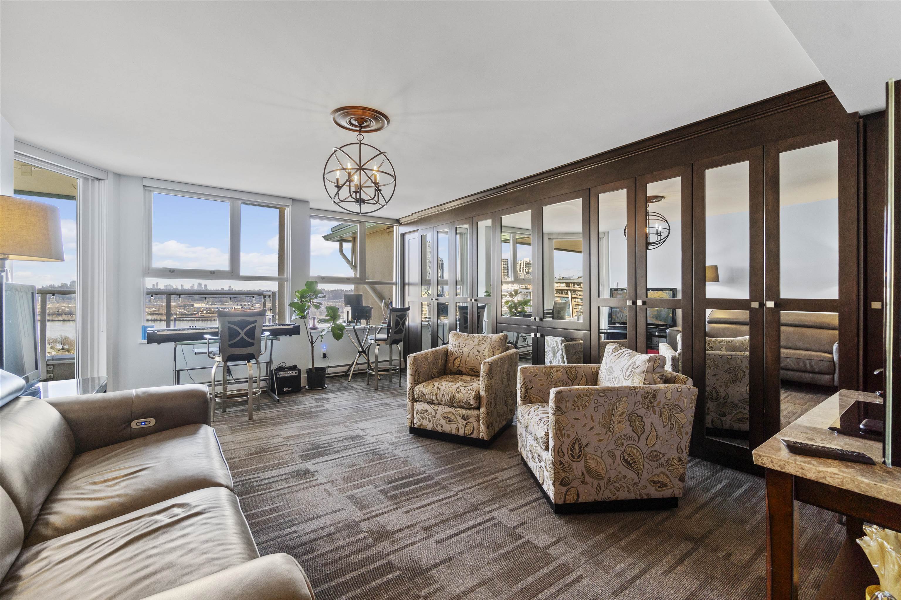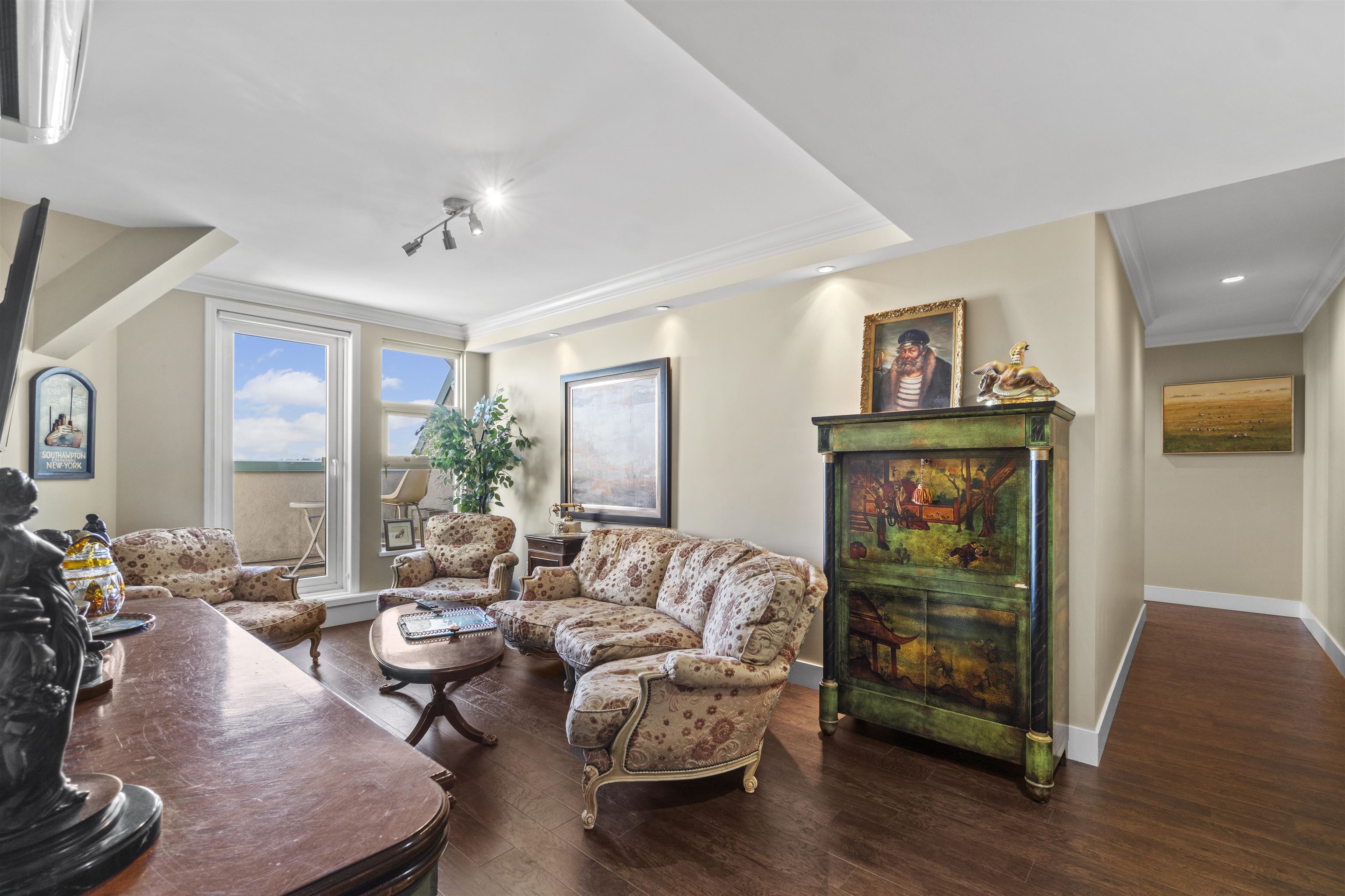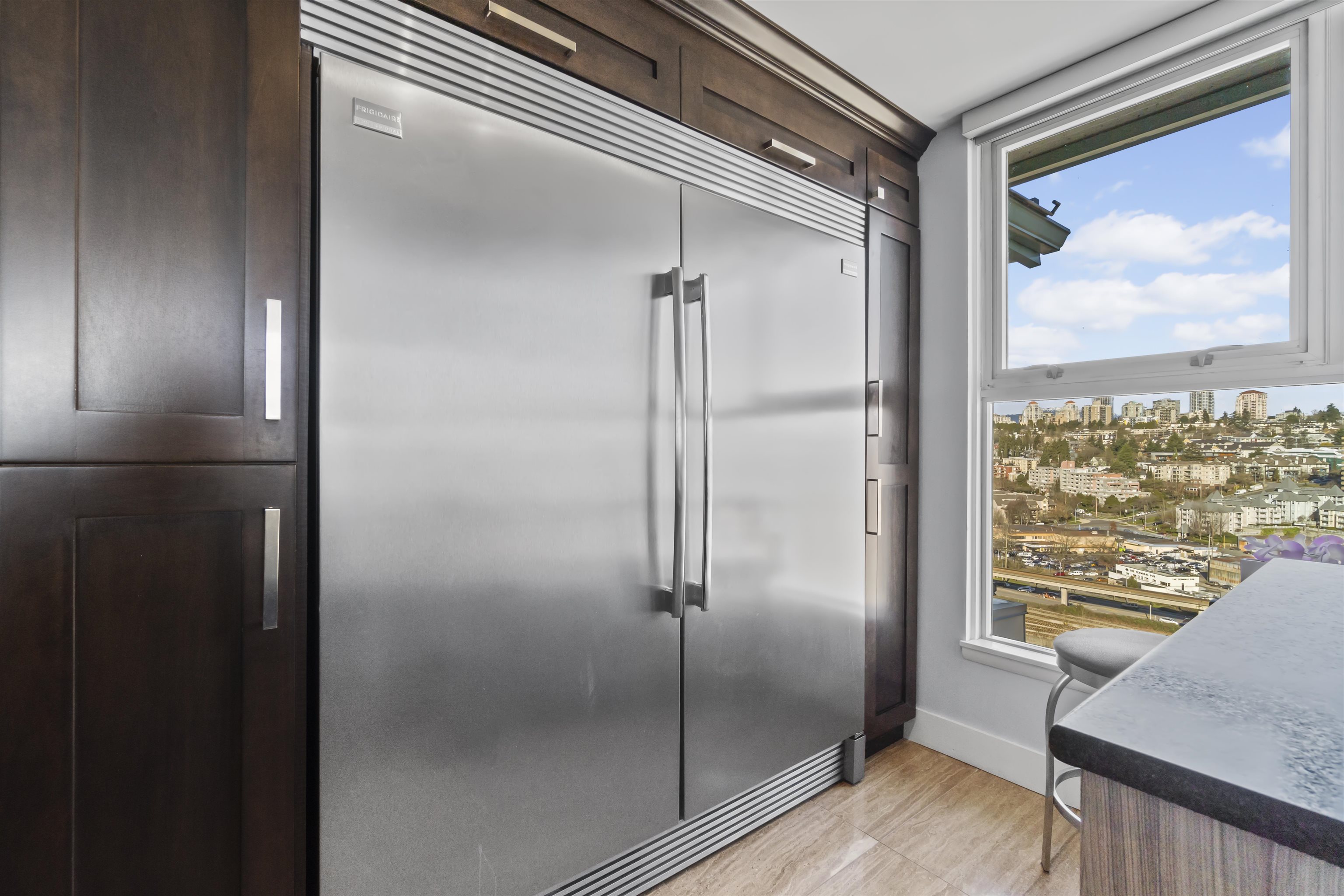 Incredible Renovation with Panoramic River Views – A Penthouse Like No Other! This luxurious penthouse blends elegance and comfort. The two-story entryway with coffered ceilings and a chandelier sets the tone, leading to a chef’s kitchen with a 14' island, double convection ovens, a full-size fridge/freezer, and an induction cooktop. Spacious living and dining areas flow to a deck, while the cozy family room with a gas fireplace opens to another with river views. The serene primary bedroom boasts a spa-like ensuite, custom closets, and a private office. Upstairs, enjoy AC, three bedrooms, a den with a fireplace, a jetted tub, and the third deck. Steps from the Seawall and SkyTrain, this is waterfront living at its finest!