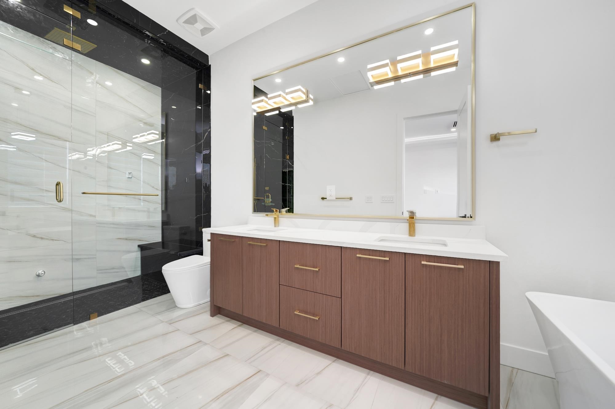 Stunning, newly built luxury custom two-story home with partial mountain views! This spacious property features 9 bedrooms and 7 bathrooms, set on a 7,200 sqft lot. The home showcases beautiful modern light fixtures, a living room, dining room, bar, family room, designer kitchen, and a separate spice kitchen with a unique, bright, and open layout. The generous master bedroom includes a full en-suite, along with 3 additional spacious bedrooms, full bathrooms, and a powder room. Additional highlights include central air conditioning, radiant hot-water heating, an HRV system, security cameras, a high-efficiency hot-water furnace, premium appliances, a sundeck, and a double car garage. Includes a 2-5-10 new home warranty. Potential rental income of $5,500. Easy to show!