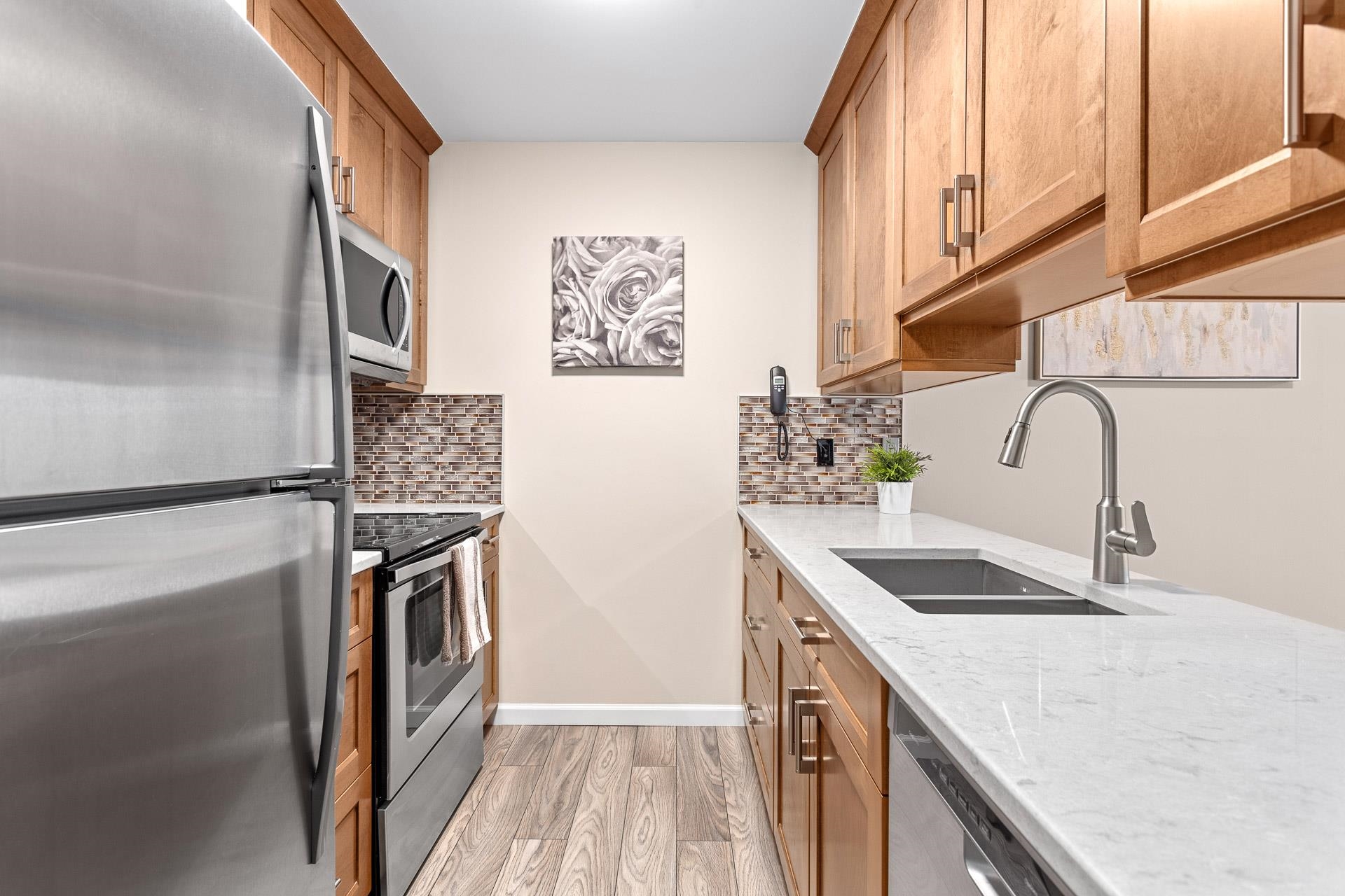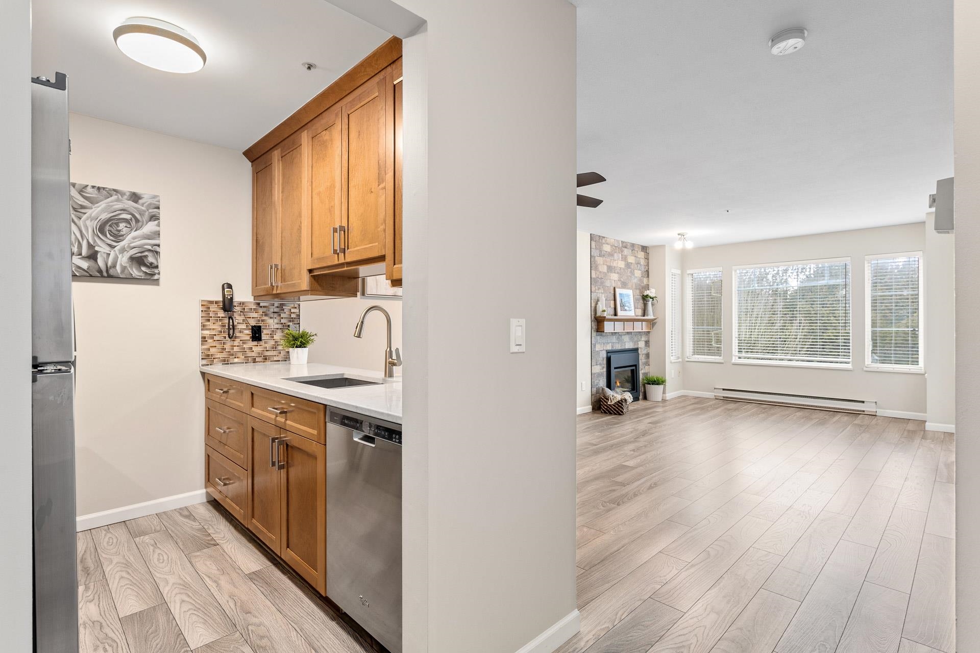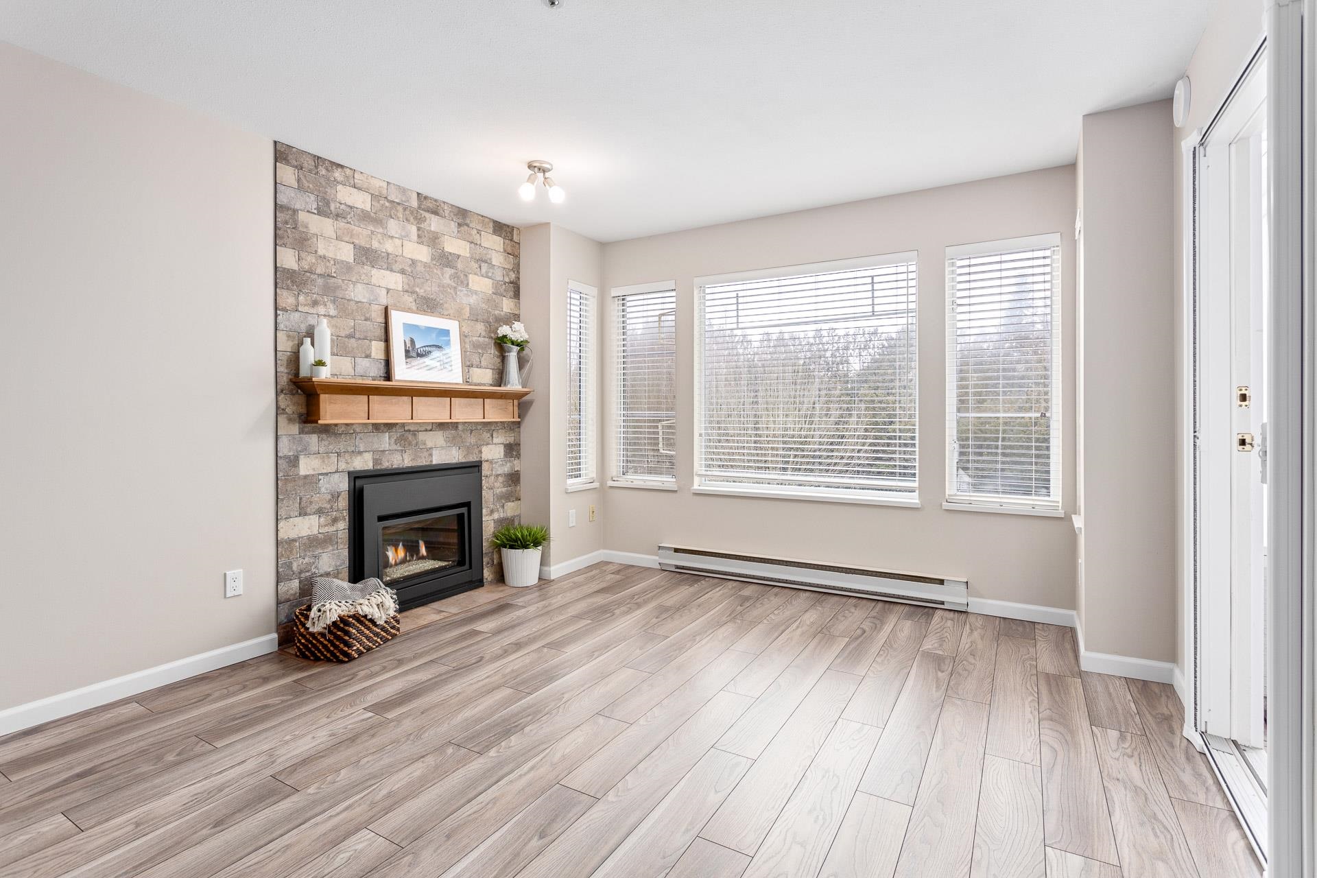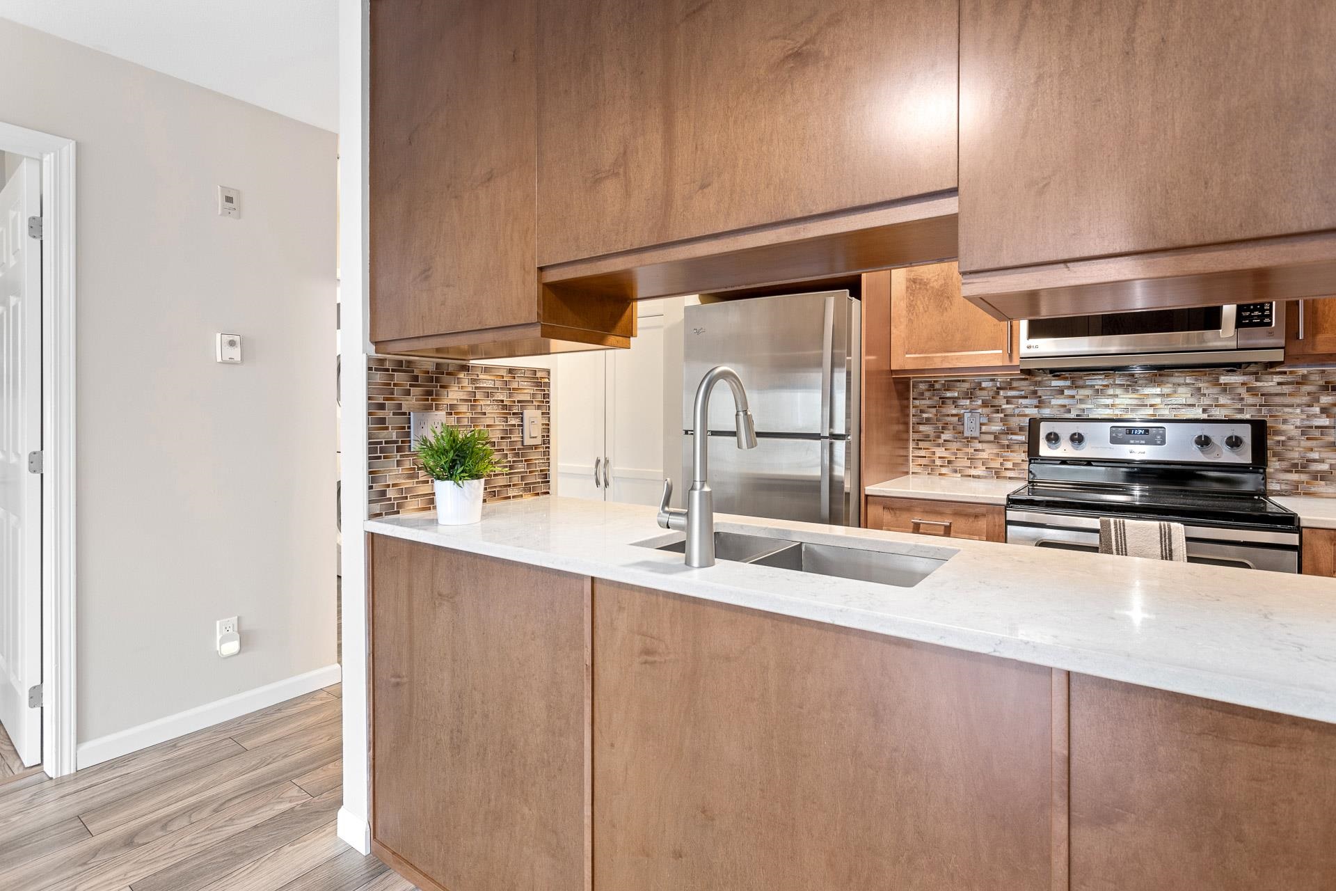 Welcome to Coventry Gate and this beautifully renovated 1 bedroom, 1 bathroom condo. Everything has been done for you. All that is left to do is move your furniture in! Kitchen has been renovated with new cabinets, tiles, appliances, quartz countertop and glass tile backsplash. Bathroom boasts more of the same with beautiful glass tile backsplash making up the feature wall and quartz counters. In the living room you will find a new and efficient gas fireplace and laminate floors. There is even a large west facing balcony with a 58 sq/ft heated storage locker. All in a great central location that is walkable to great shopping and restaurants and about a 12 min walk to the future Skytrain station. (furnished living room photo is virtually staged)