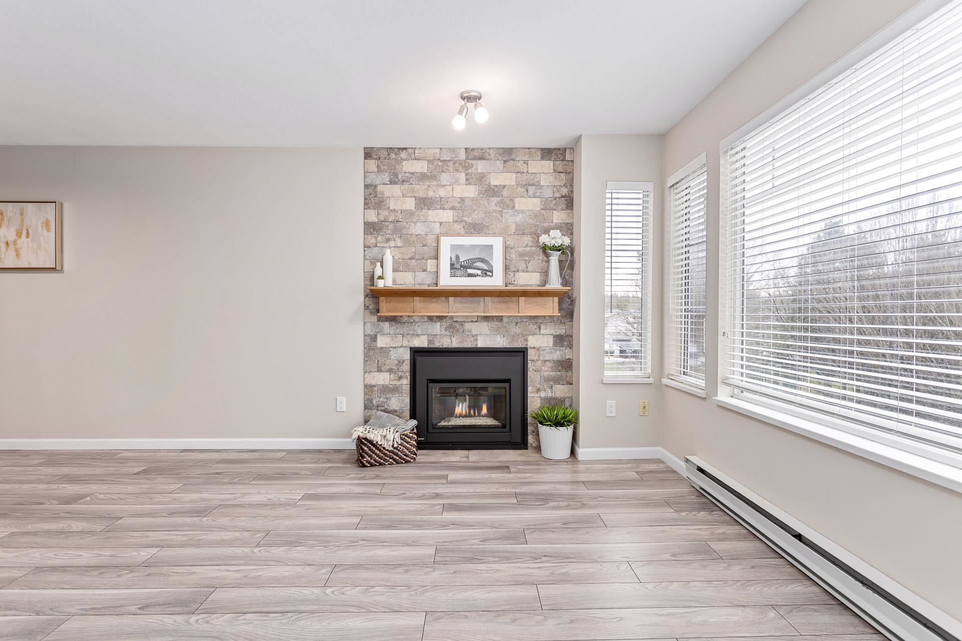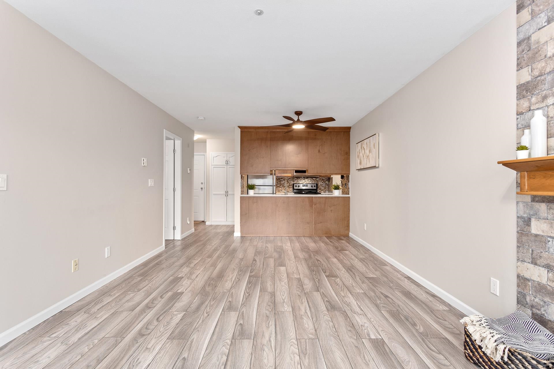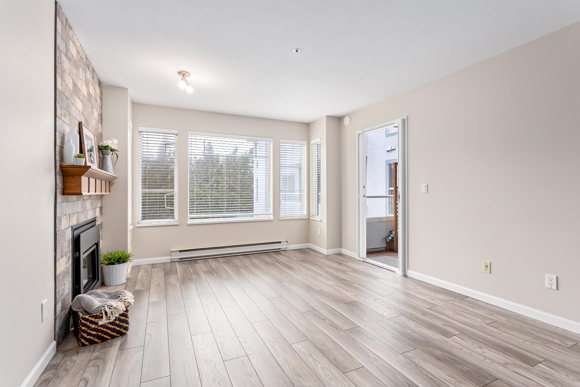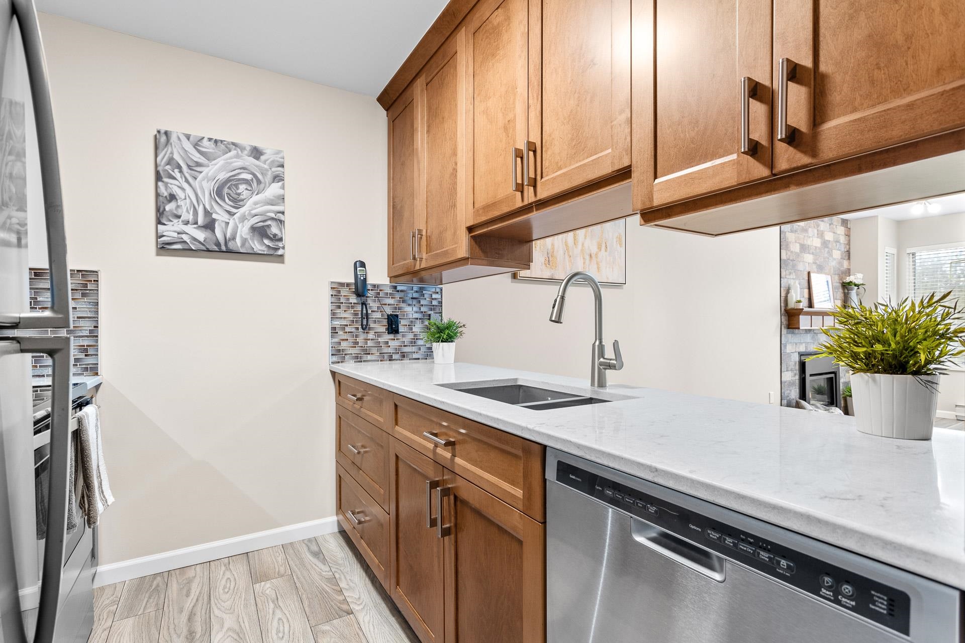 Welcome to Coventry Gate and this beautifully renovated 1 bedroom, 1 bathroom condo. Everything has been done for you. All that is left to do is move your furniture in! Kitchen has been renovated with new cabinets, tiles, appliances, quartz countertop and glass tile backsplash. Bathroom boasts more of the same with beautiful glass tile backsplash making up the feature wall and quartz counters. In the living room you will find a new and efficient gas fireplace and laminate floors. There is even a large west facing balcony with a 58 sq/ft heated storage locker. All in a great central location that is walkable to great shopping and restaurants and about a 12 min walk to the future Skytrain station. (furnished living room photo is virtually staged)