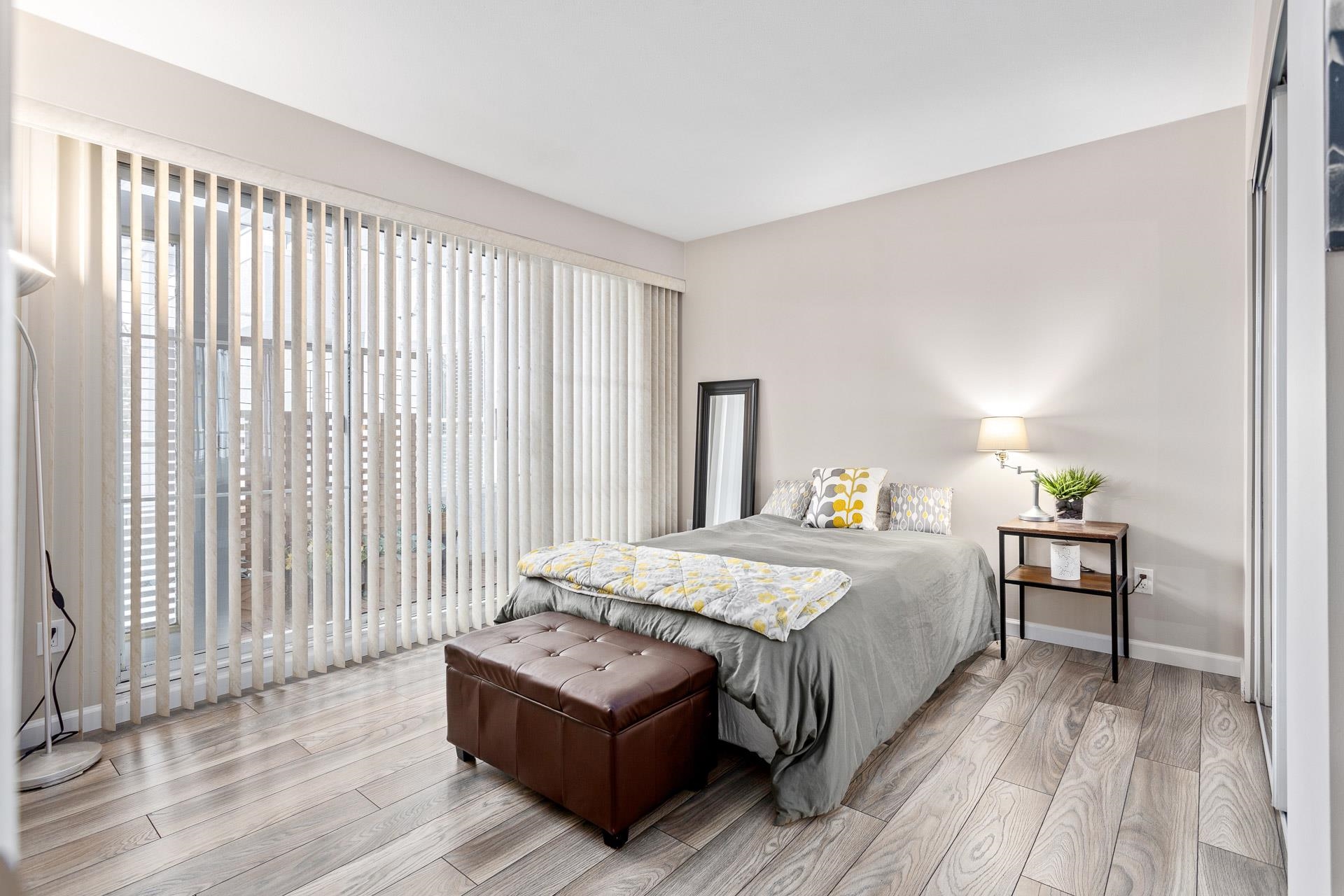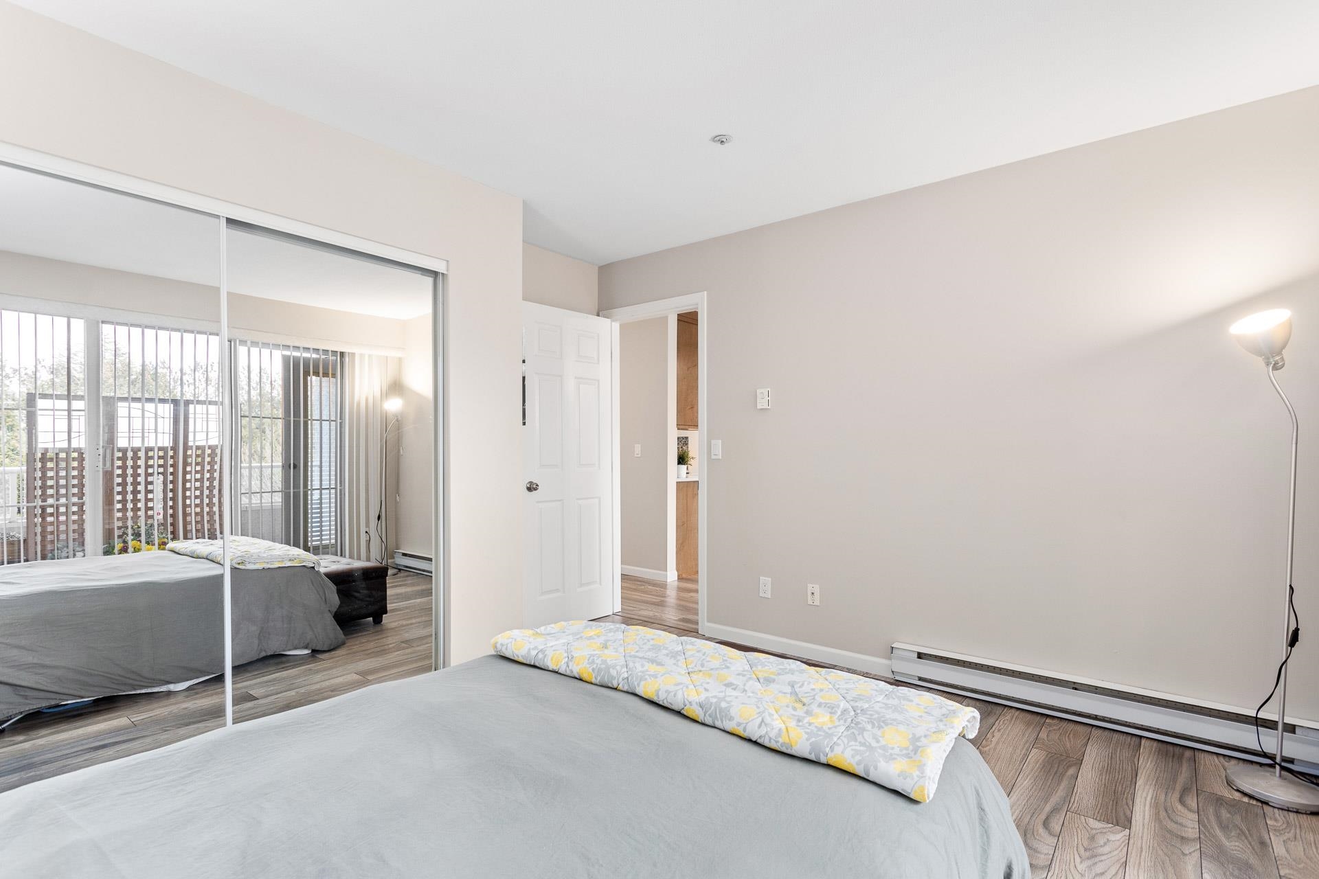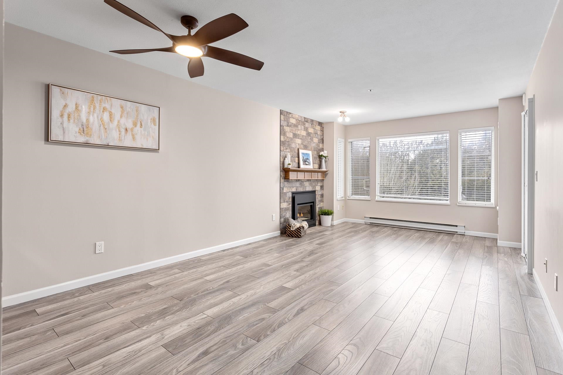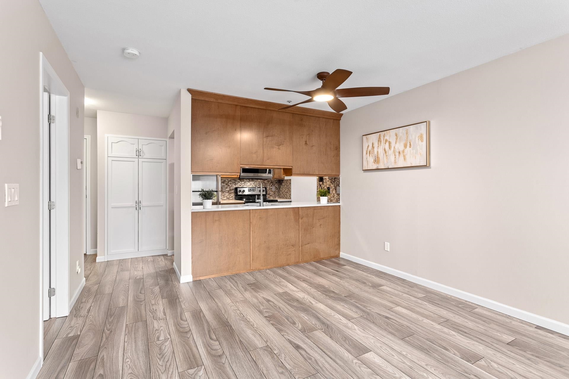 Welcome to Coventry Gate and this beautifully renovated 1 bedroom, 1 bathroom condo. Everything has been done for you. All that is left to do is move your furniture in! Kitchen has been renovated with new cabinets, tiles, appliances, quartz countertop and glass tile backsplash. Bathroom boasts more of the same with beautiful glass tile backsplash making up the feature wall and quartz counters. In the living room you will find a new and efficient gas fireplace and laminate floors. There is even a large west facing balcony with a 58 sq/ft heated storage locker. All in a great central location that is walkable to great shopping and restaurants and about a 12 min walk to the future Skytrain station. (furnished living room photo is virtually staged)