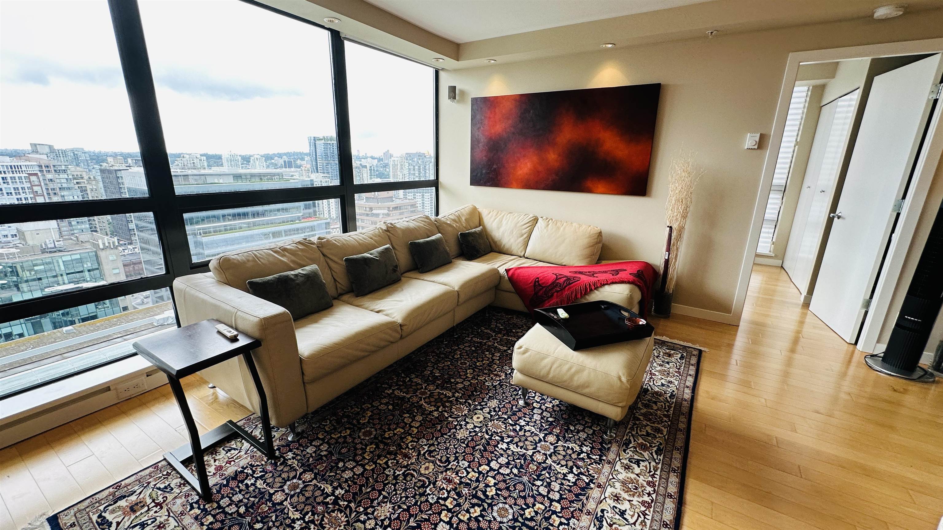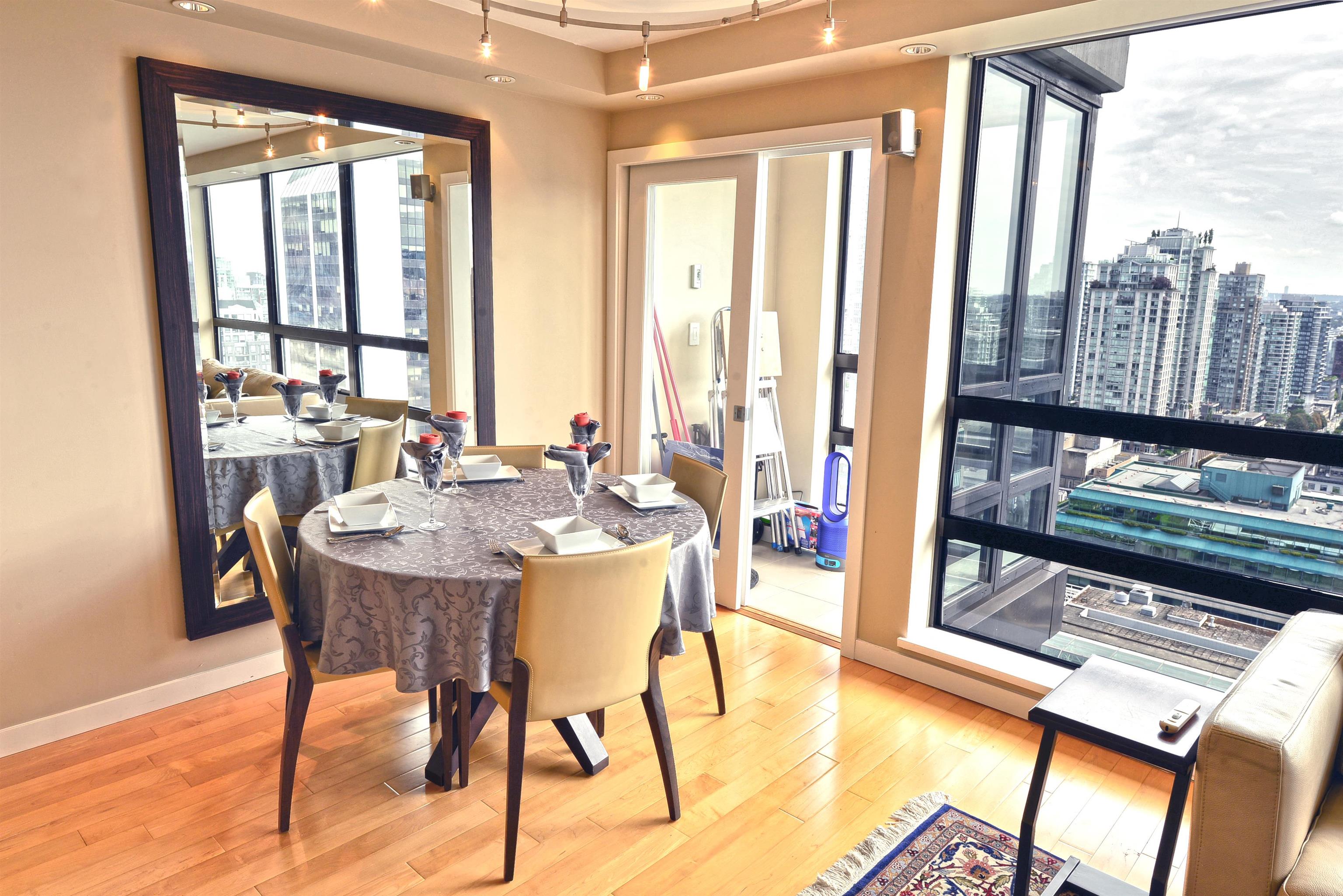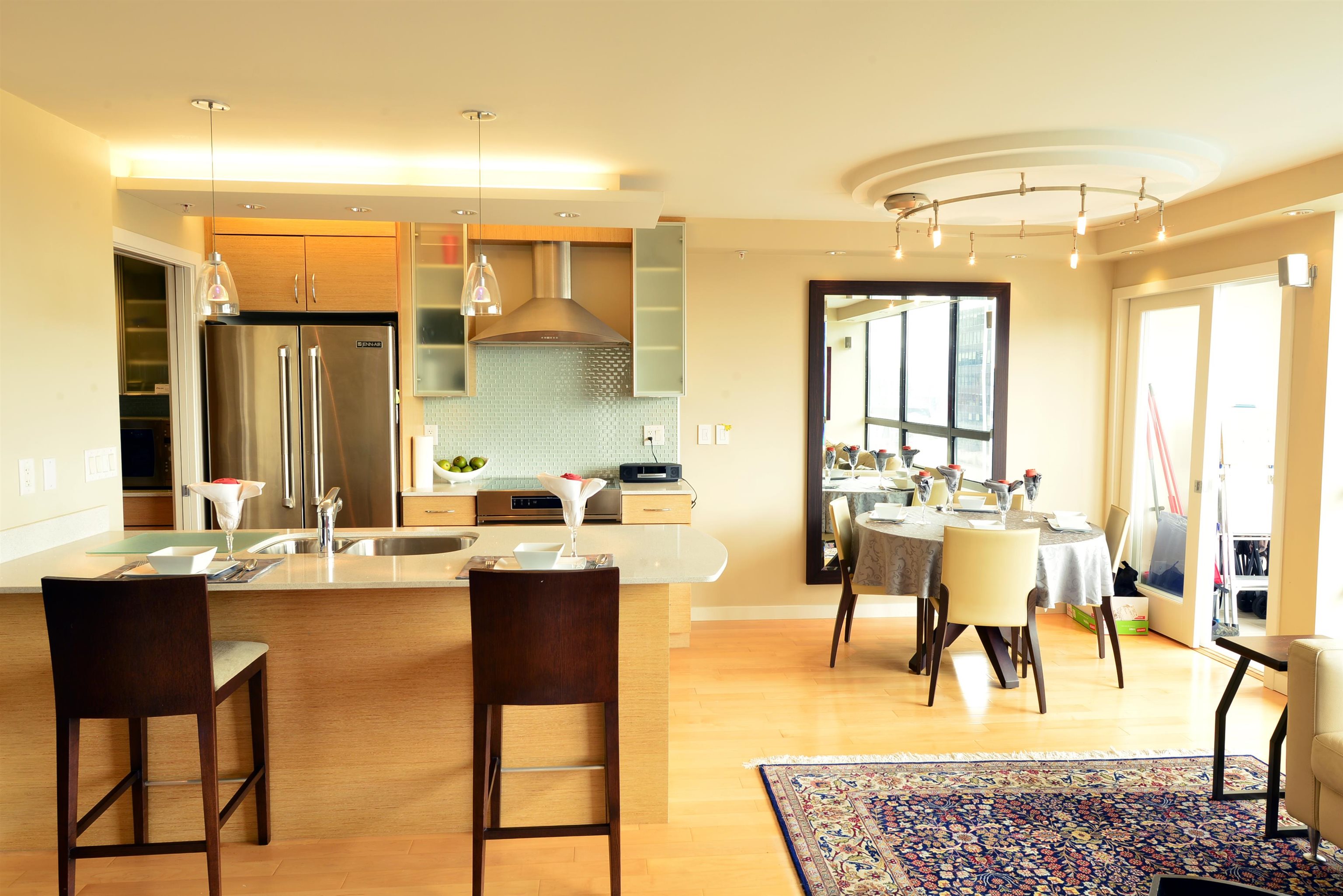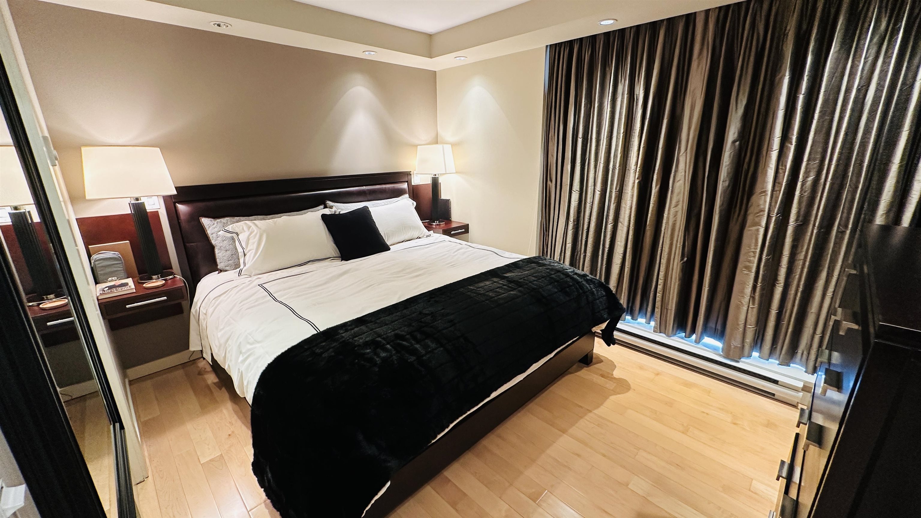 PENTHOUSE. Enjoy spectacular city & some water views from this Customized 2 bedroom unit. This gorgeous unit features a large living and dining room, a Master bedroom with an ensuite, Hardwood floors, Gourmet SS appliances and a wine cooler. The building has 24-hour concierge, gym, party, meeting & theatre rooms. The location is unbeatable, steps away from Burrard station, YMCA, IGA market, Robson Street shops, restaurants & coffee shops.