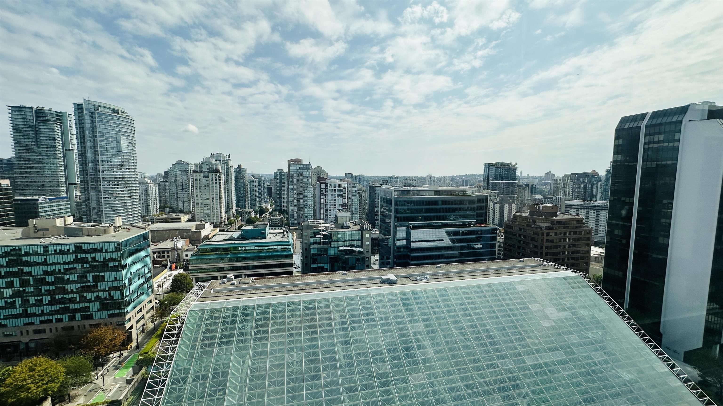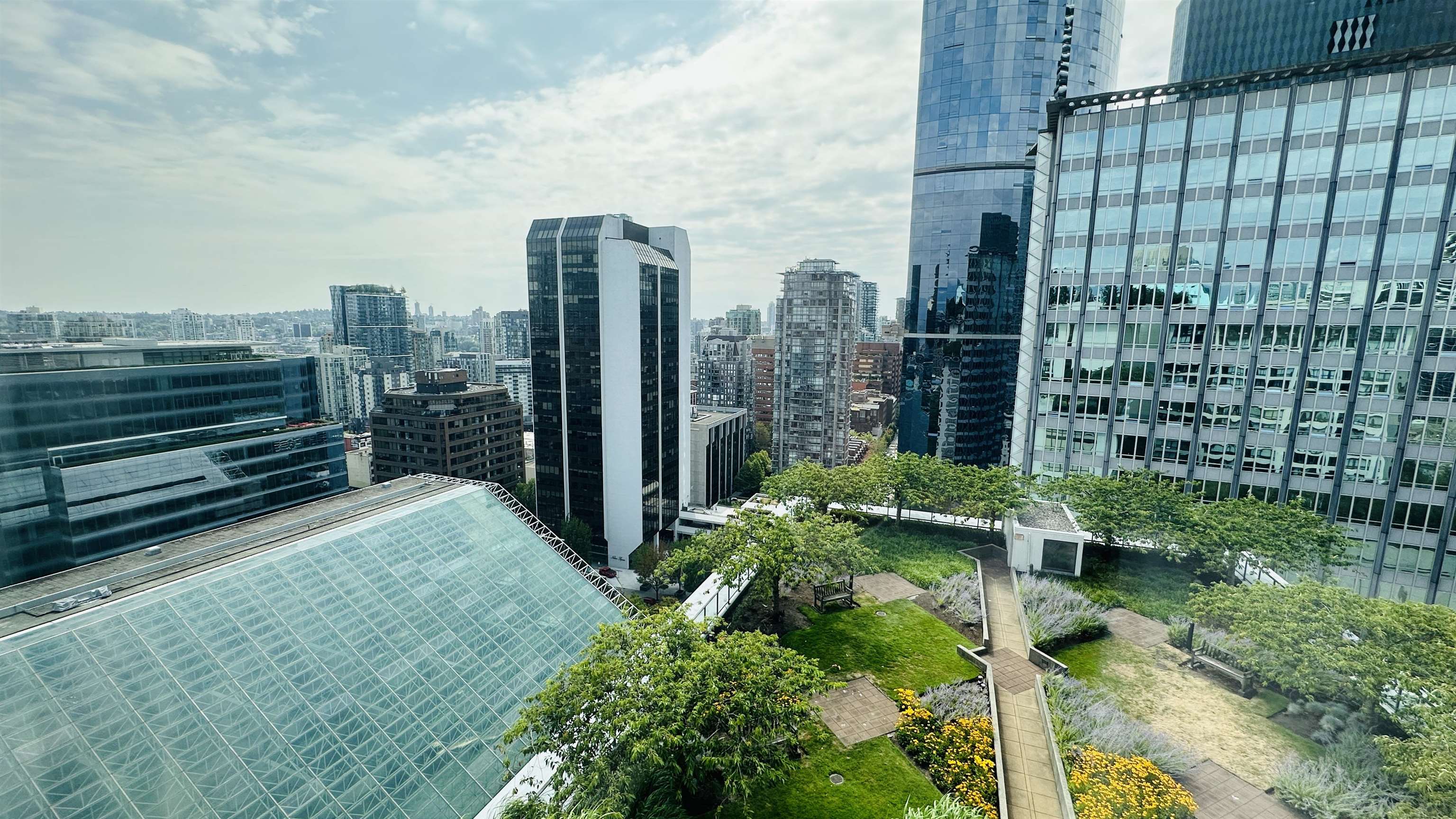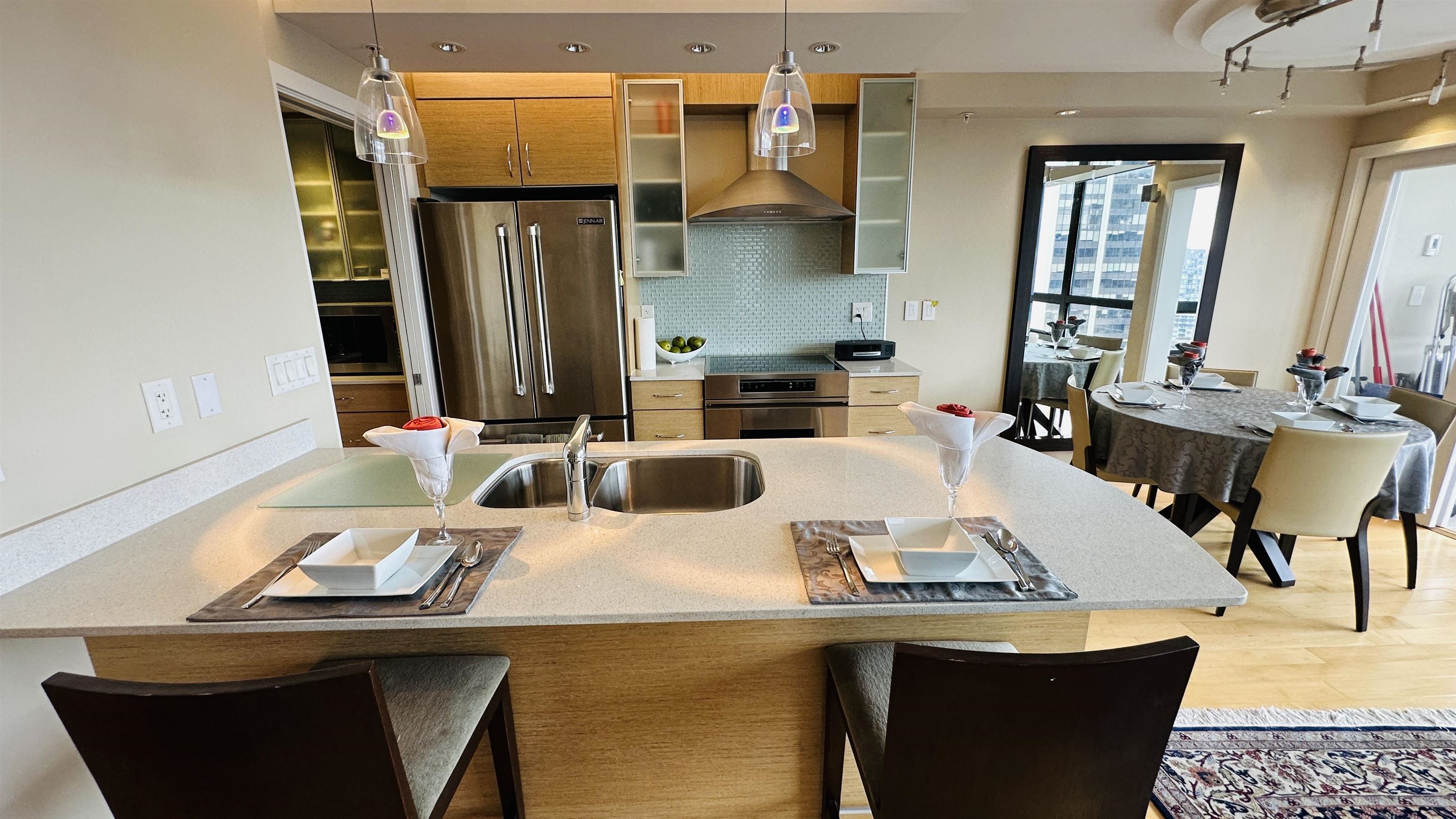PENTHOUSE. Enjoy spectacular city & some water views from this Customized 2 bedroom unit. This gorgeous unit features a large living and dining room, a Master bedroom with an ensuite, Hardwood floors, Gourmet SS appliances and a wine cooler. The building has 24-hour concierge, gym, party, meeting & theatre rooms. The location is unbeatable, steps away from Burrard station, YMCA, IGA market, Robson Street shops, restaurants & coffee shops.