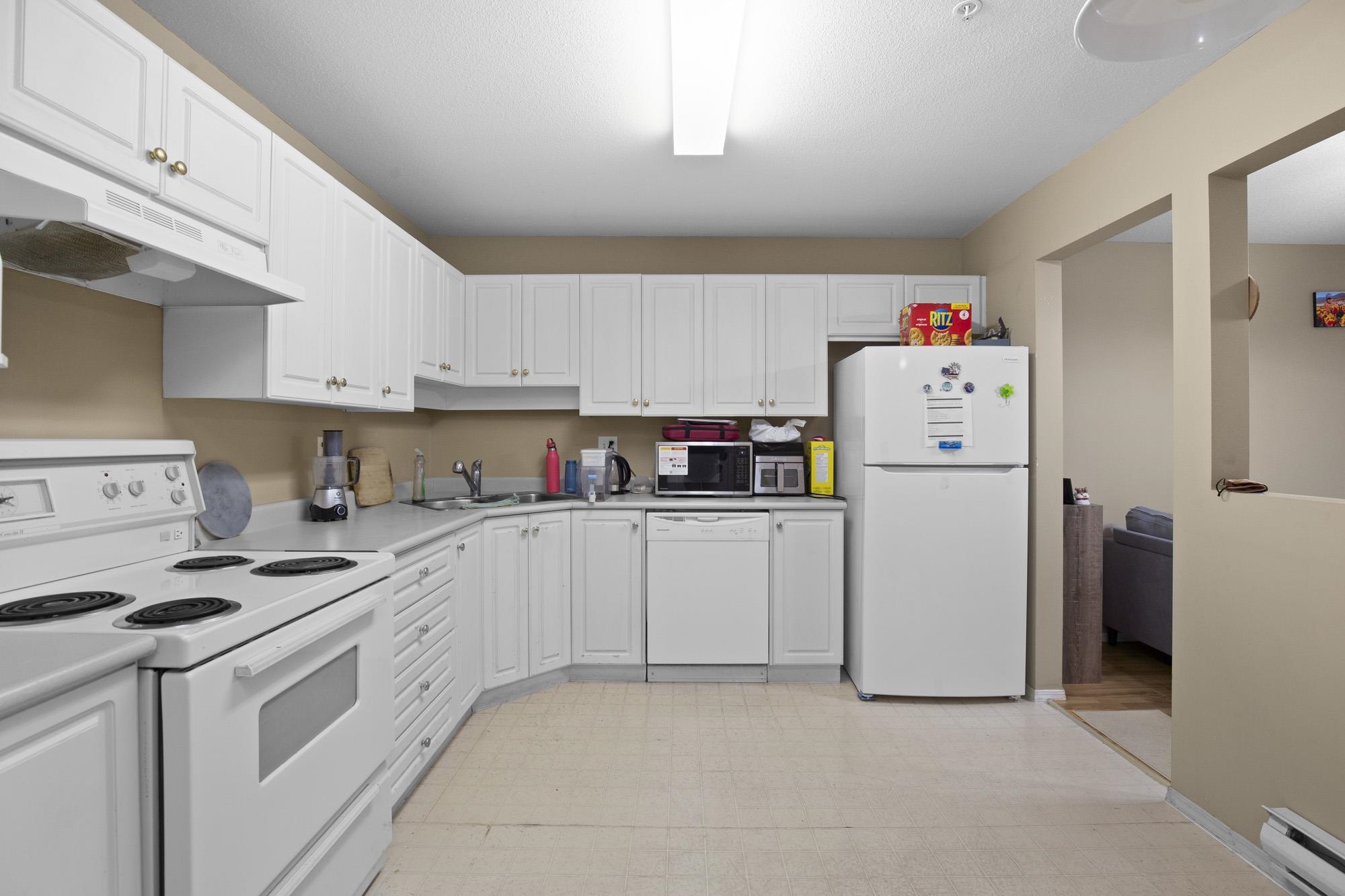 2 bedroom, 2 full bath condo in a very well run complex! Spacious layout, 1022 sq ft. Open plan with large kitchen & living area with gas fireplace. Primary bdrm with 3 pce ensuite & walk-in closet. Full size insuite laundry room. Make this your home or it can be a turn key investment property with an excellent existing tenant. Great location with easy freeway access, close to High Street Mall & the amazing trails of Fish Trap Creek Park.