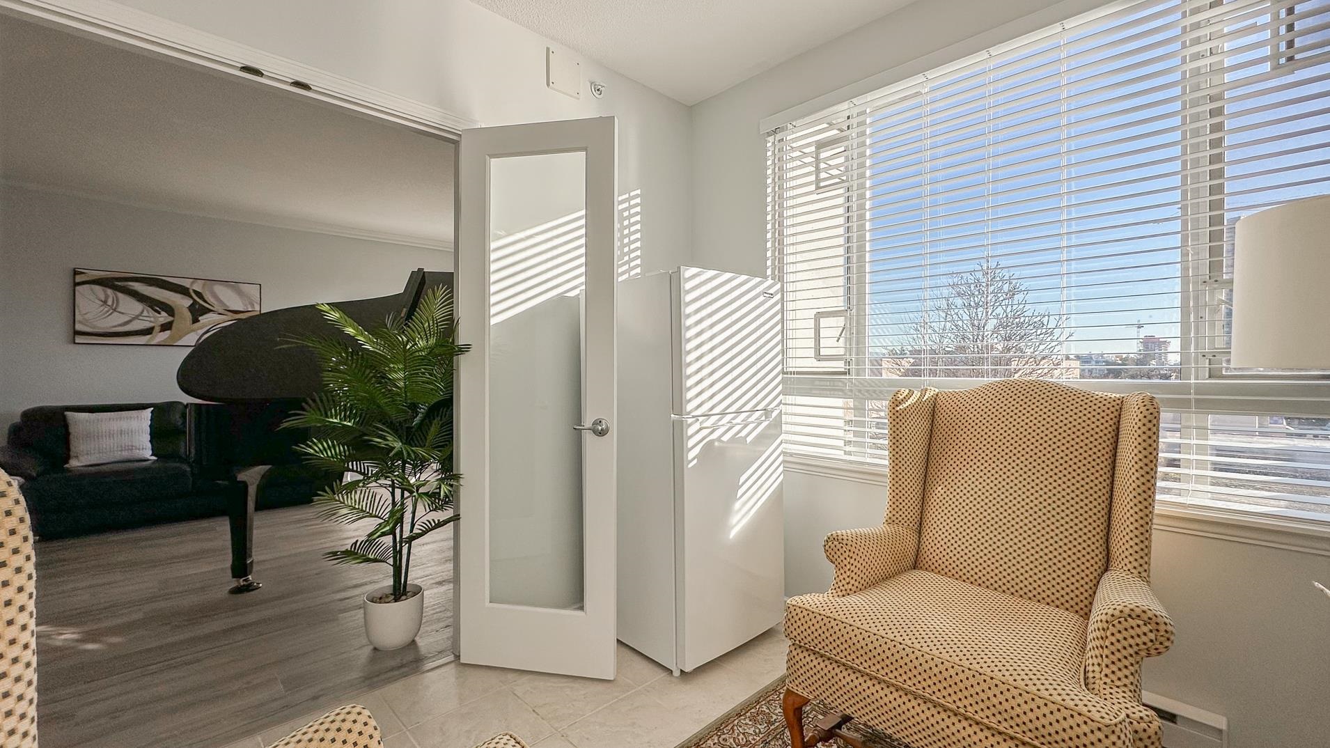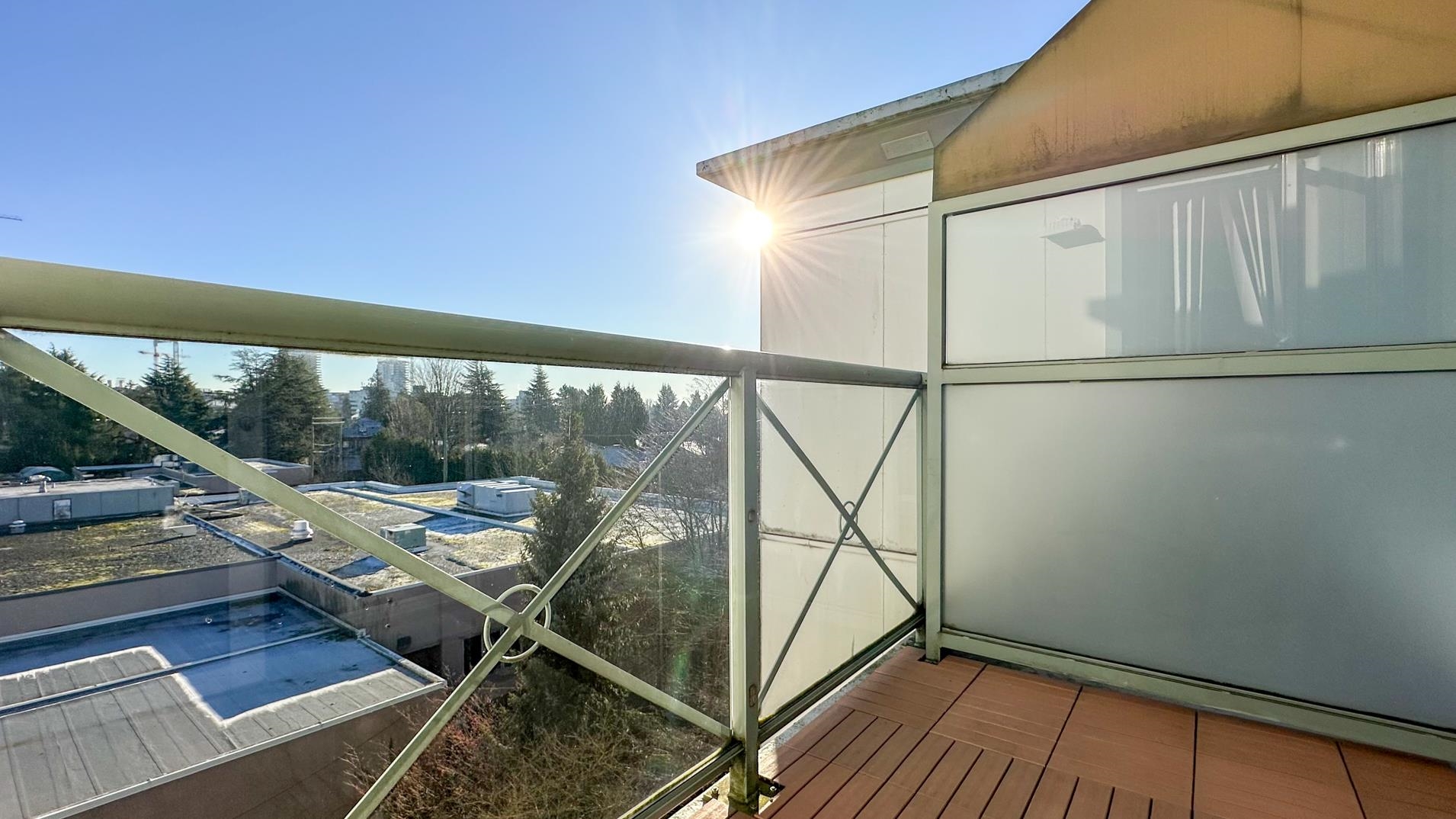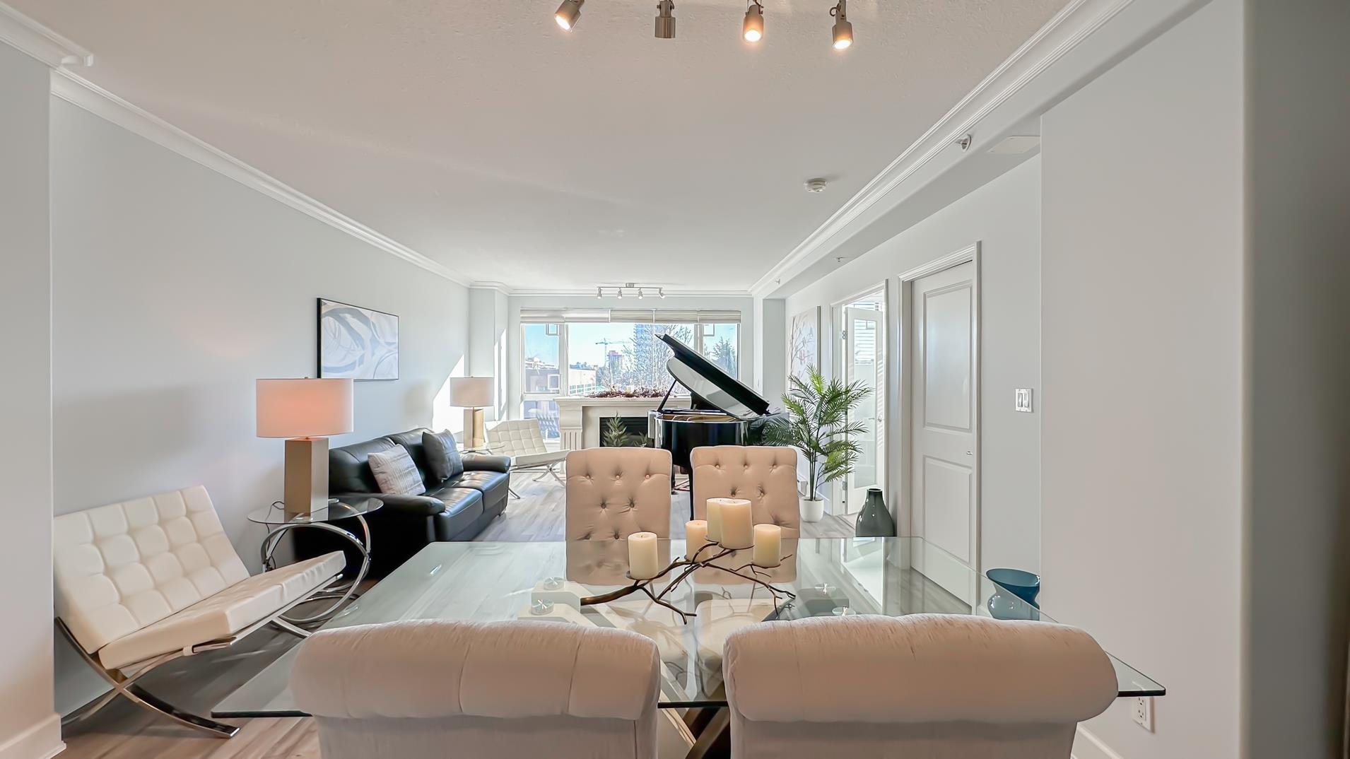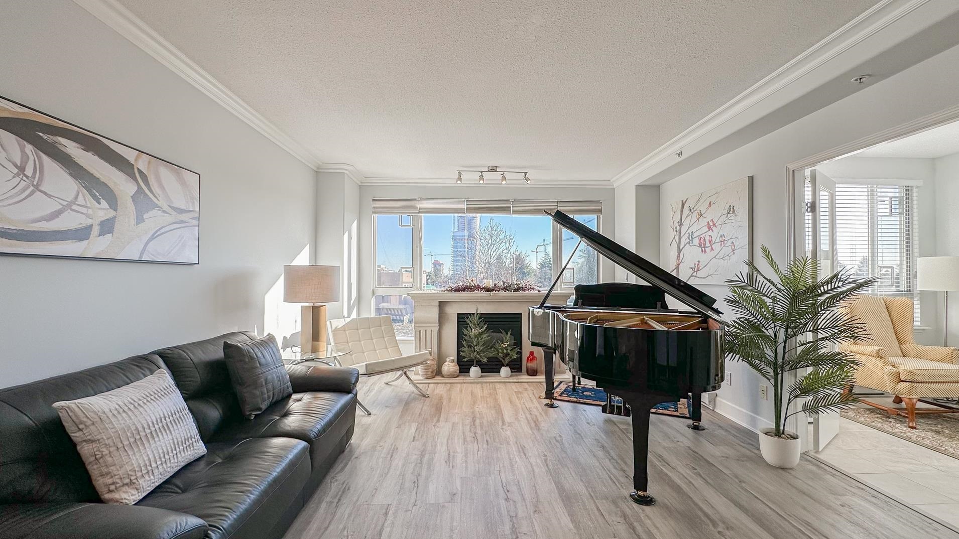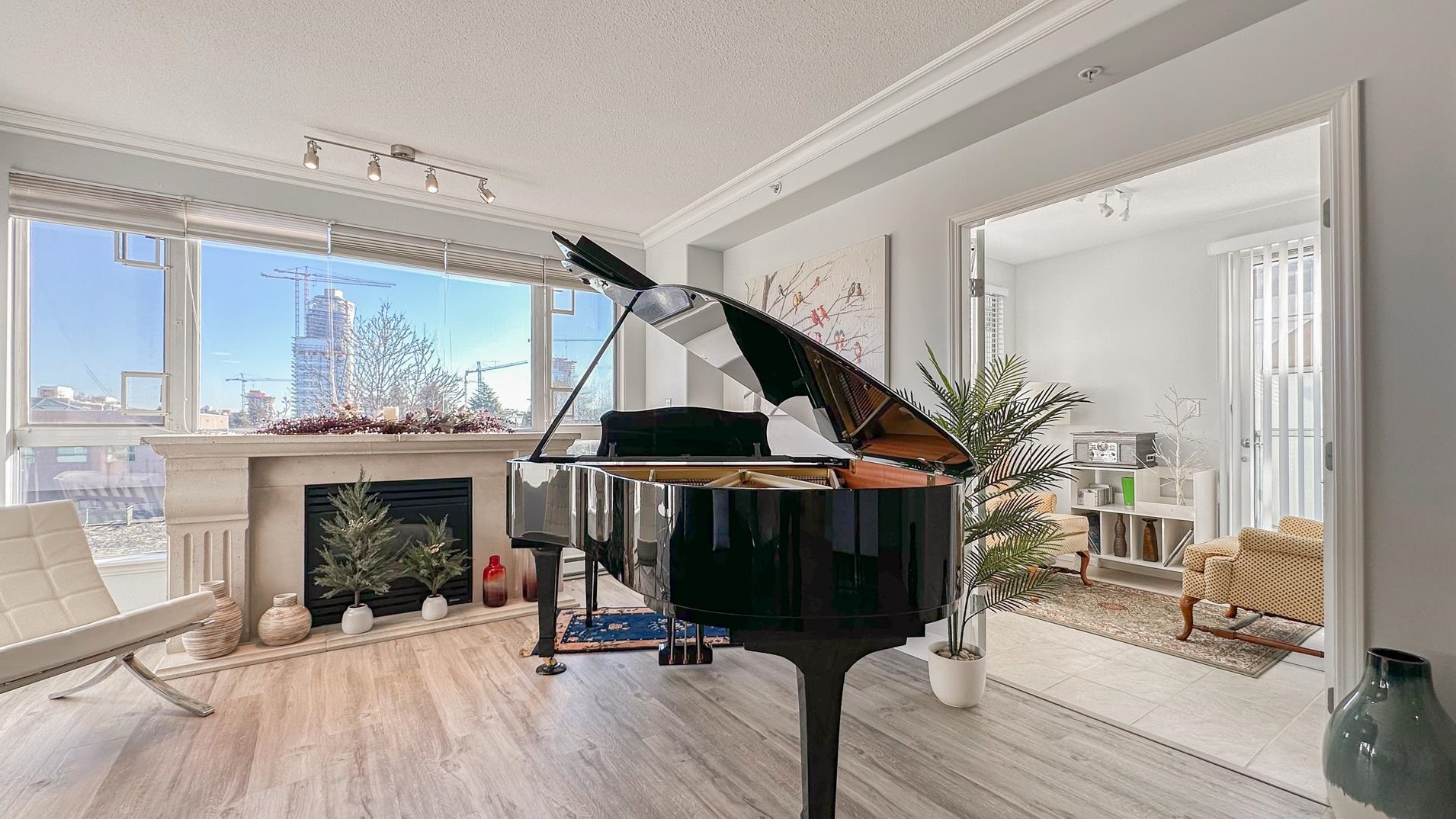 Spacious 1241sqft unit!! The Crowne on Oak offers a top-floor suite in a concrete building with 2 bedrooms and a den. This TOP-FLOOR unit has master bedroom that includes a 6'9" x 5'8" walk-in closet. Features include a gas fireplace with an electronic thermostat, 2 full bathrooms with heated floors in the master bath, and 36" square walk-in showers. The living and dining areas have crown molding, and windows have screens. The second bedroom and den have custom blinds. The kitchen had been updated includes a new cooktop, microwave, and fridge with slide-out shelves. This 1241 sq ft east-facing unit has a patio with some North Shore Mountain views. Building is conveniently located near to Oakridge Centre, and VanDusen Gardens. Call to book viewing.