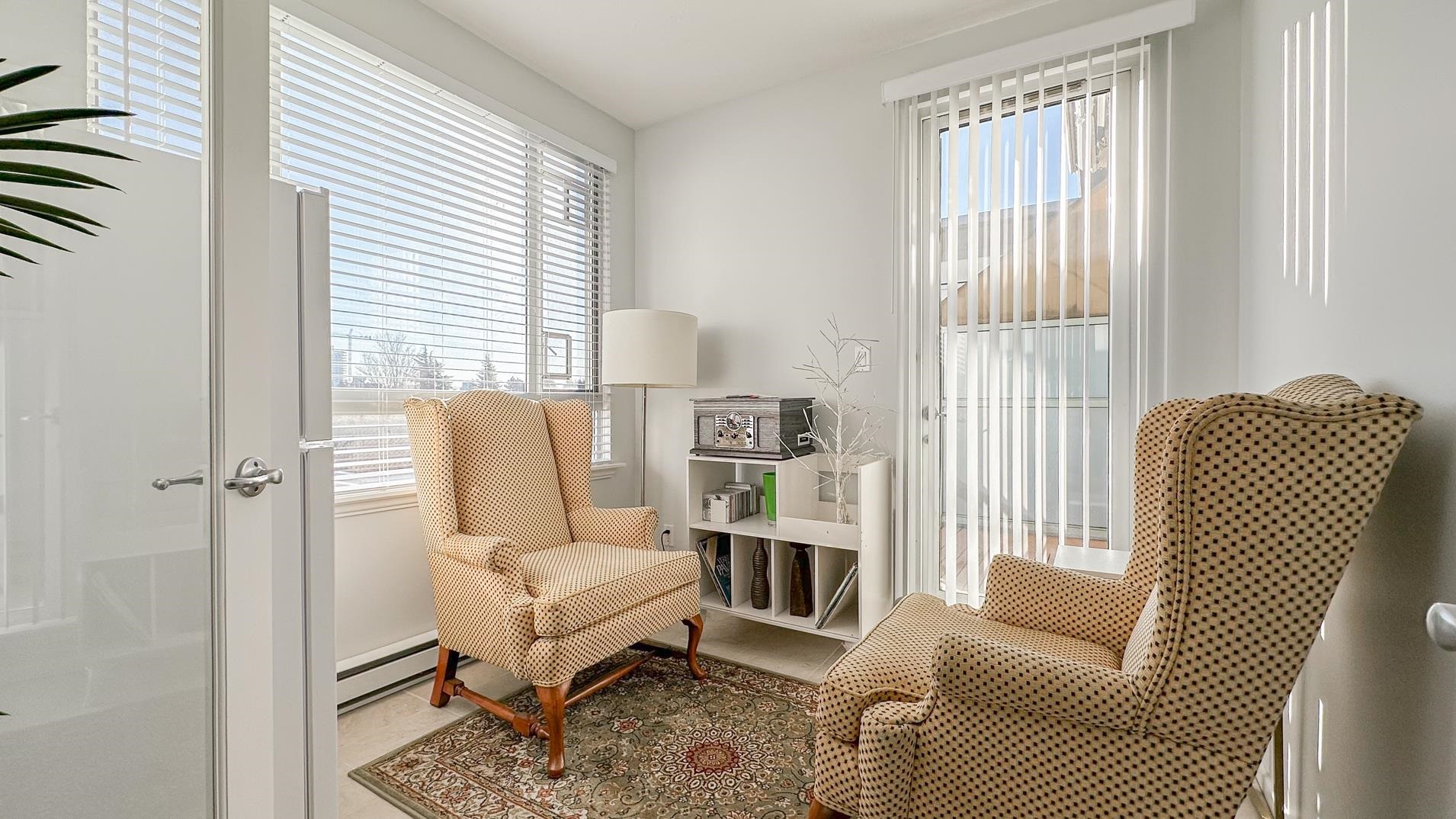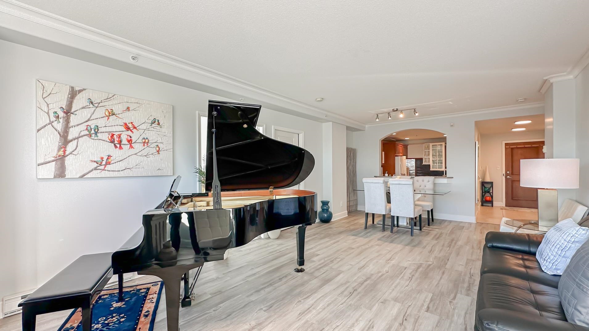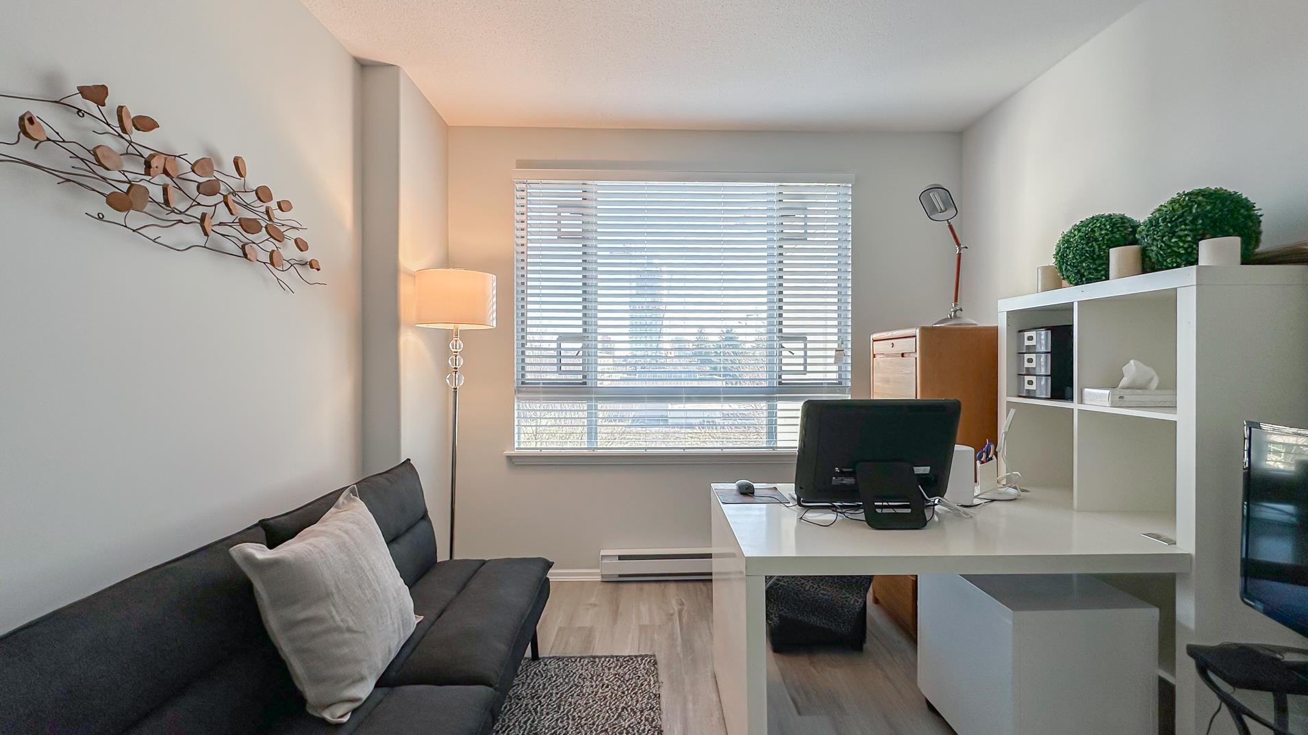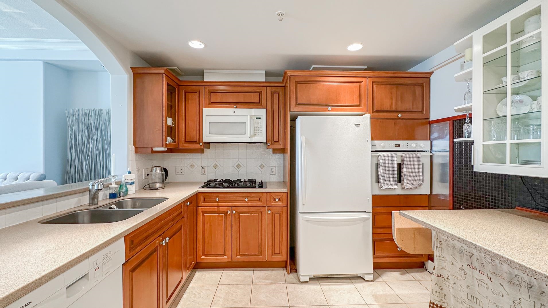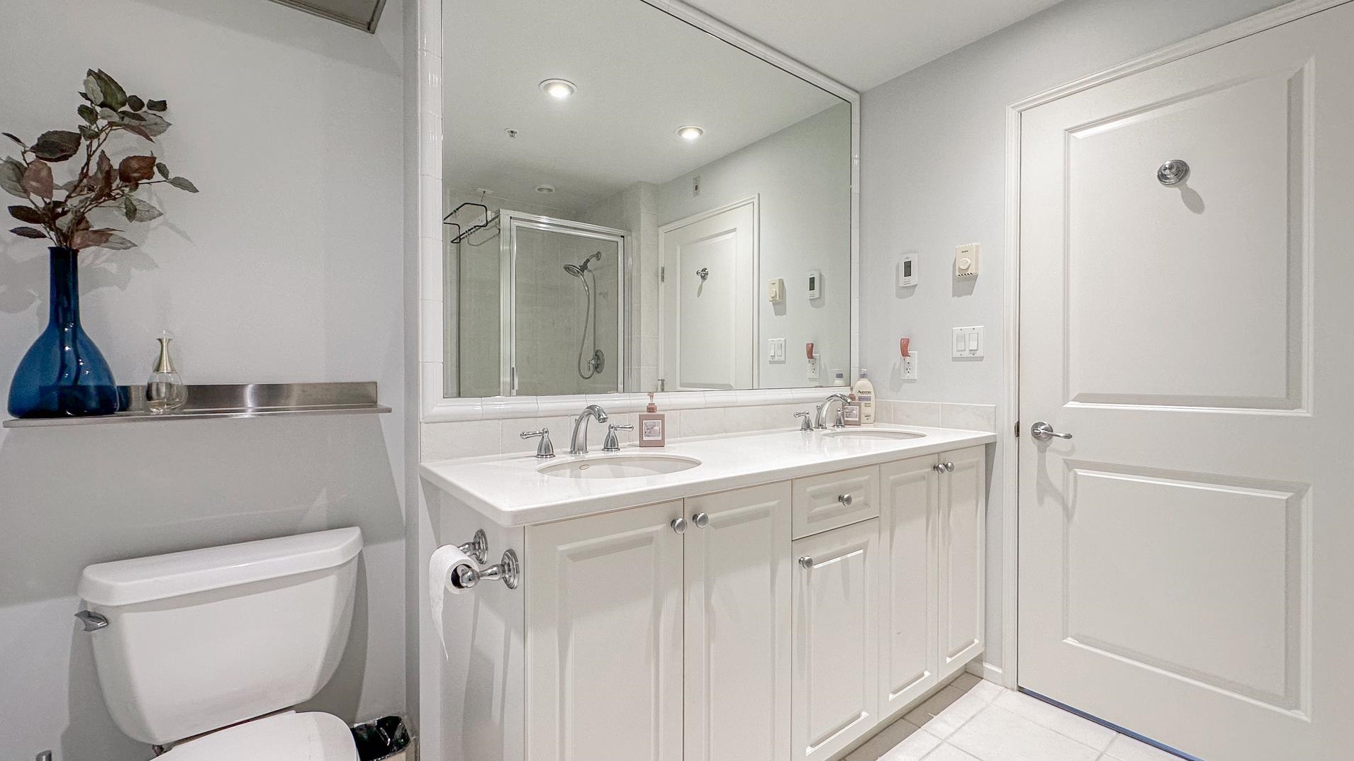 Spacious 1241sqft unit!! The Crowne on Oak offers a top-floor suite in a concrete building with 2 bedrooms and a den. This TOP-FLOOR unit has master bedroom that includes a 6'9" x 5'8" walk-in closet. Features include a gas fireplace with an electronic thermostat, 2 full bathrooms with heated floors in the master bath, and 36" square walk-in showers. The living and dining areas have crown molding, and windows have screens. The second bedroom and den have custom blinds. The kitchen had been updated includes a new cooktop, microwave, and fridge with slide-out shelves. This 1241 sq ft east-facing unit has a patio with some North Shore Mountain views. Building is conveniently located near to Oakridge Centre, and VanDusen Gardens. Call to book viewing.